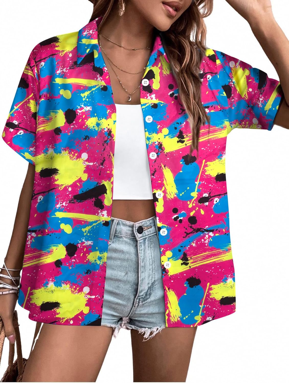 80s Outfits Women 80s 90s Neon Shirt Retro Theme Party Disco Shirt Hawaiian Button Down Short Sleeve Tops