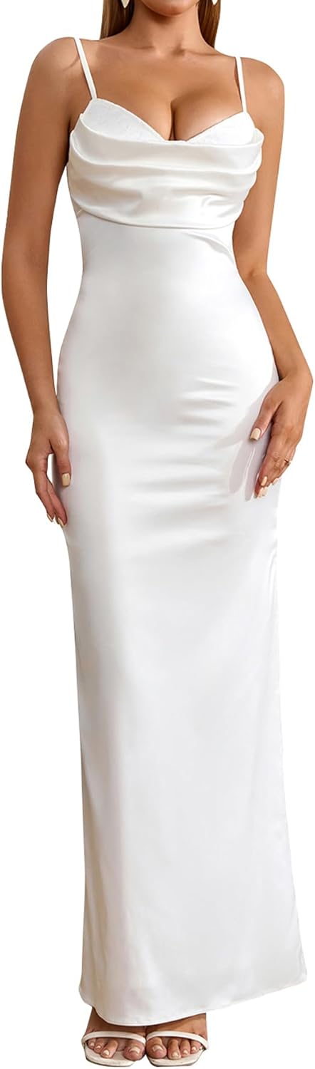 EYNMIN Women's Satin Spaghetti Strap Maxi Dress Lace Cowl Neck Backless Bodycon Long Cocktail Wedding Guest Dresses