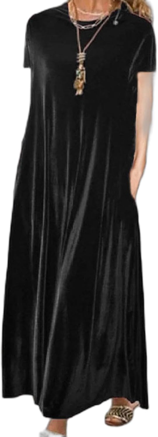 Velvet Long Sleeve Maxi Dress for Women Fall Wedding Guest Cocktail Dresses Loose Fit Crew Neck Flowy Plus Size
