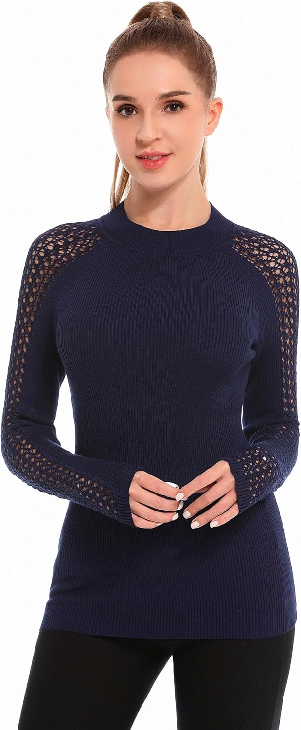 AmélieBoutik Women Crewneck Crochet Eyelet Trim Raglan Long Sleeve Sweater