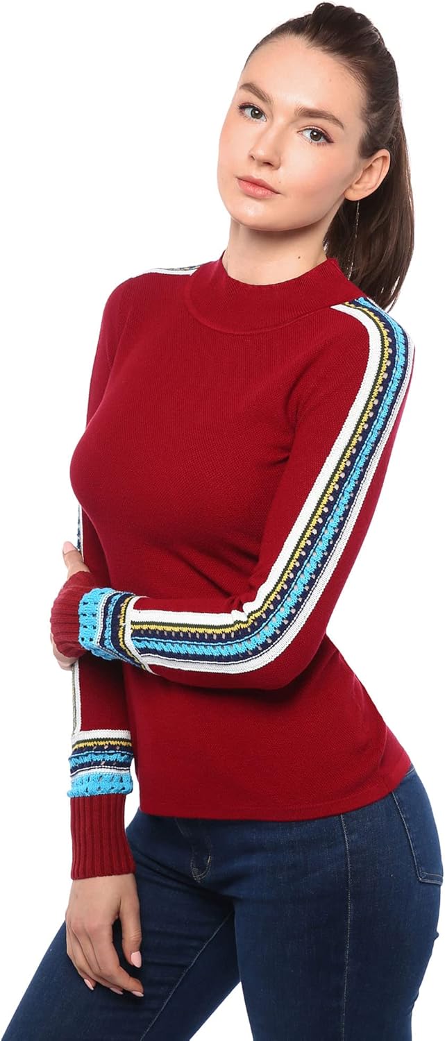 AmélieBoutik Women Mock Neck Fair Isle Trim Long Sleeve Pullover Knit Sweater