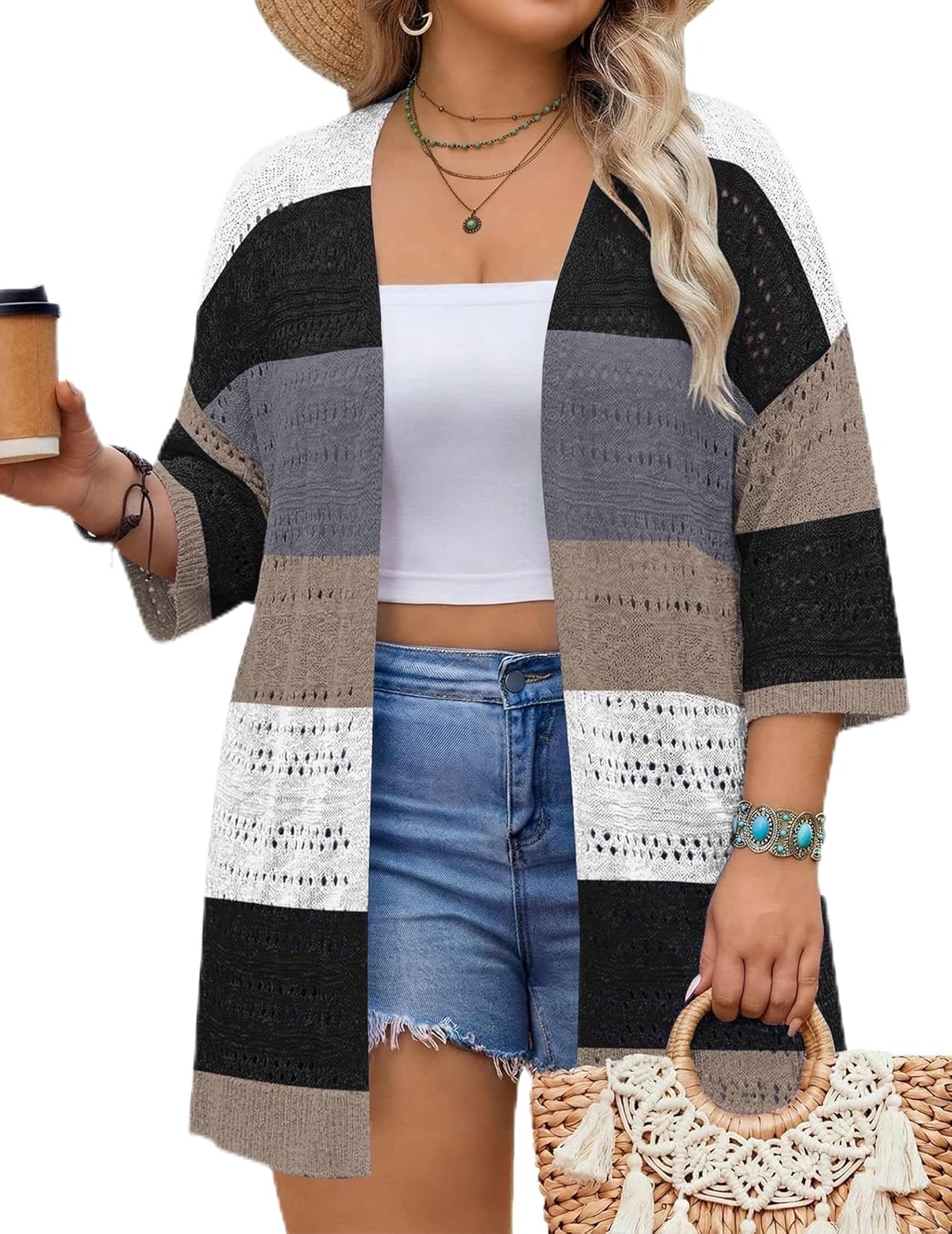IN'VOLAND Plus Size Crochet Cardigan for Women Summer Lightweight 3/4 Sleeve Kimono Boho Open Front Knitted Cardigans