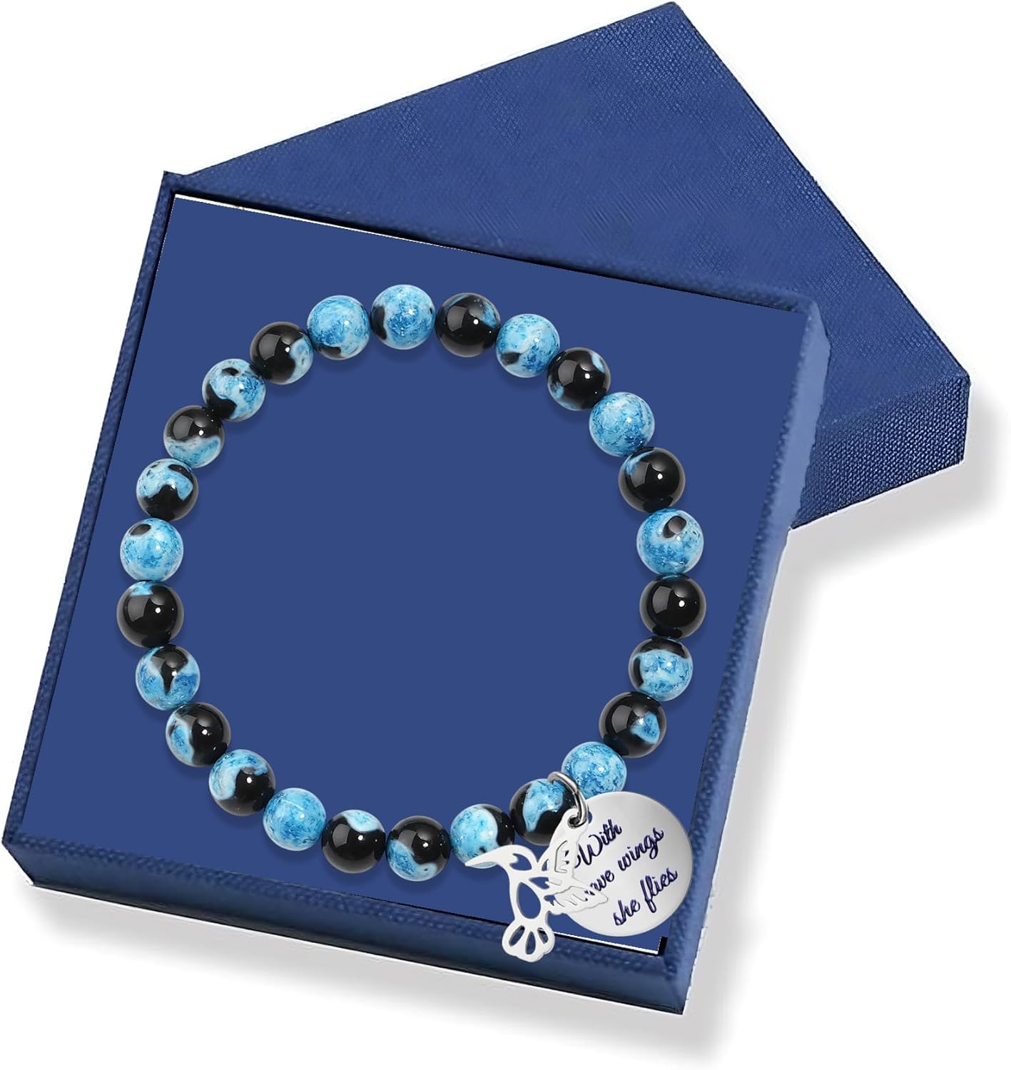 Hummingbird Bracelet Hummingbird Gift for Women Blue Black Natural Fire Agate Beaded Stainless Steel Hummingbird Charm With Brave Wings She Flies Inspirational Gift for women