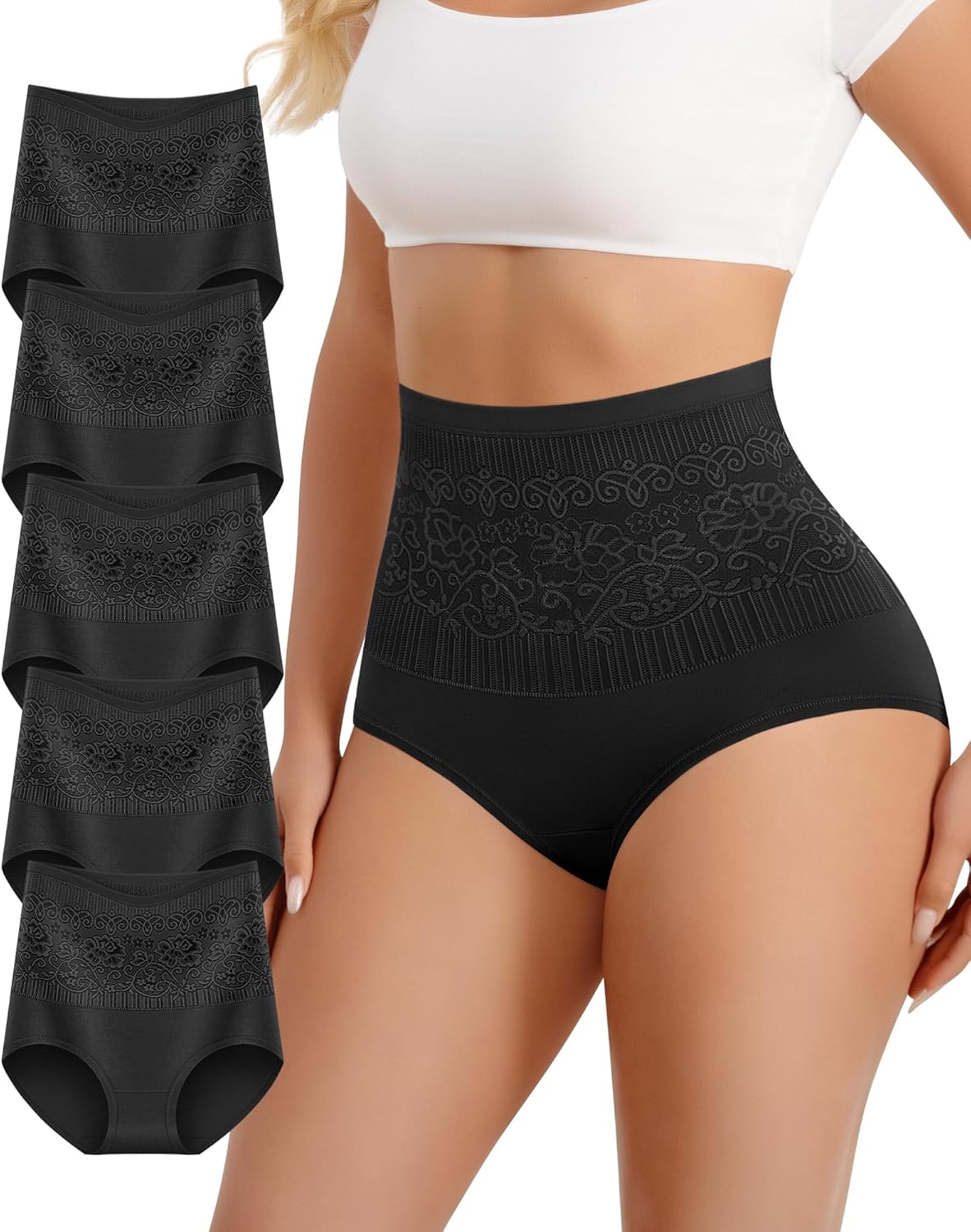Women's Cotton High Waisted Underwear Stretch Panties Full Coverage Postpartum Soft Briefs Breathable 5 Pack