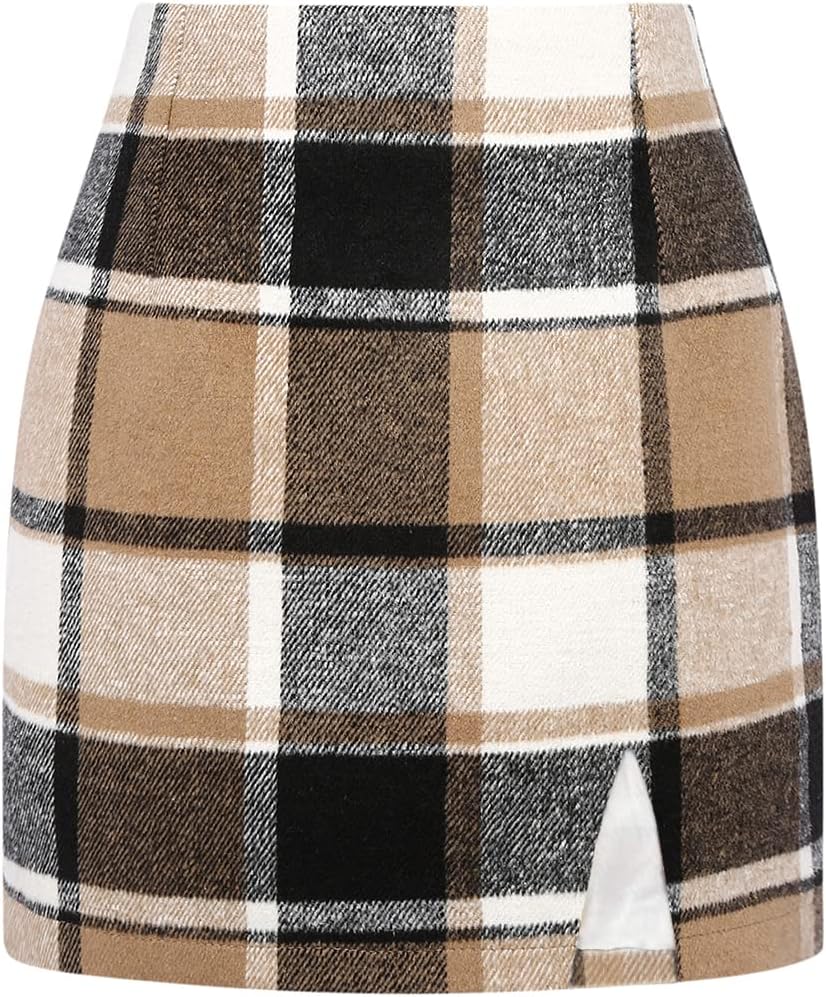Plaid Mini Skirts for Womens High Waisted Fall Winter Wool Bodycon Pencil Skirts with Slit