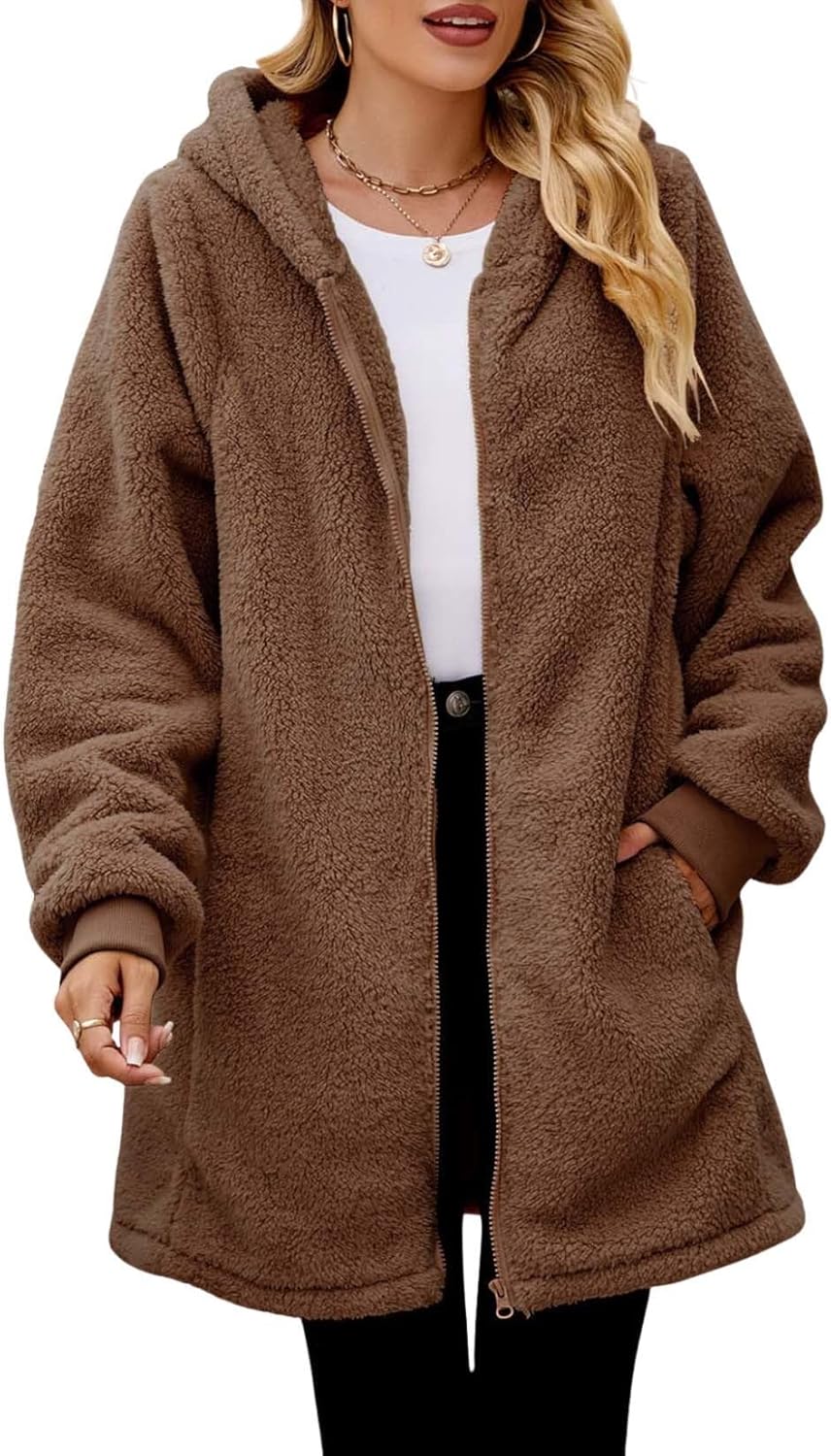 LIZALIG Women's Oversized Fleece Jacket Hooded Zip-Up Cardigan Coat with Pockets Warm Winter Casual Wear for Vacation