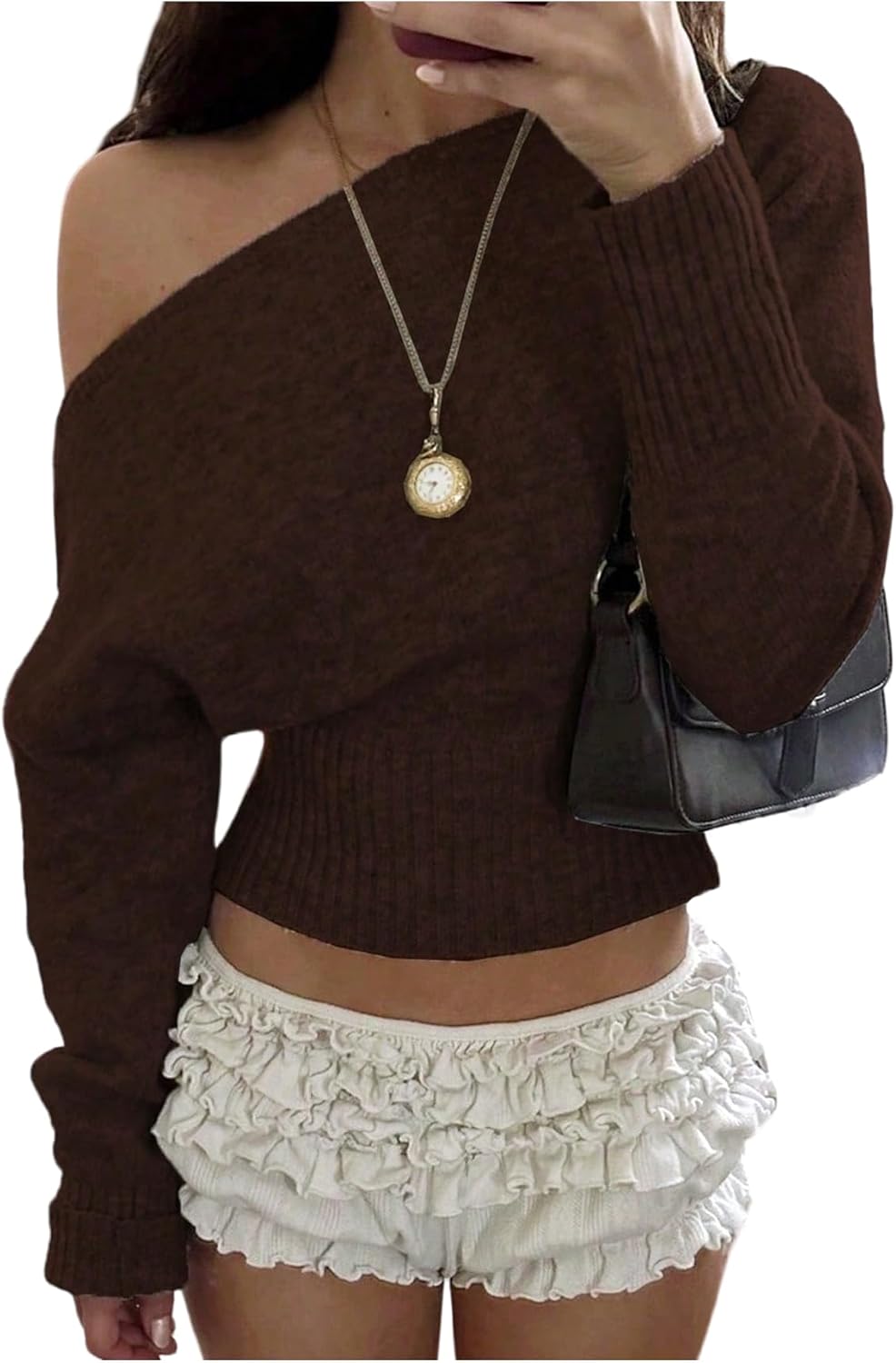 MakeMeChic Women's Cropped Sweaters Long Sleeve Off The Shoulder Sweater Y2k Going Out Tops