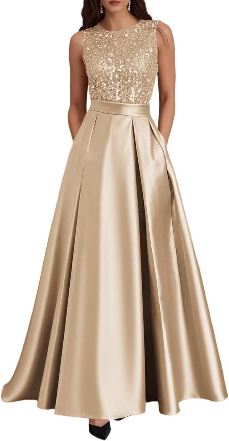 Long Satin Mother of The Bride Dress Scoop Neck Sequin Prom Party Dresses Sleeveless Ball Gown DD-DD051
