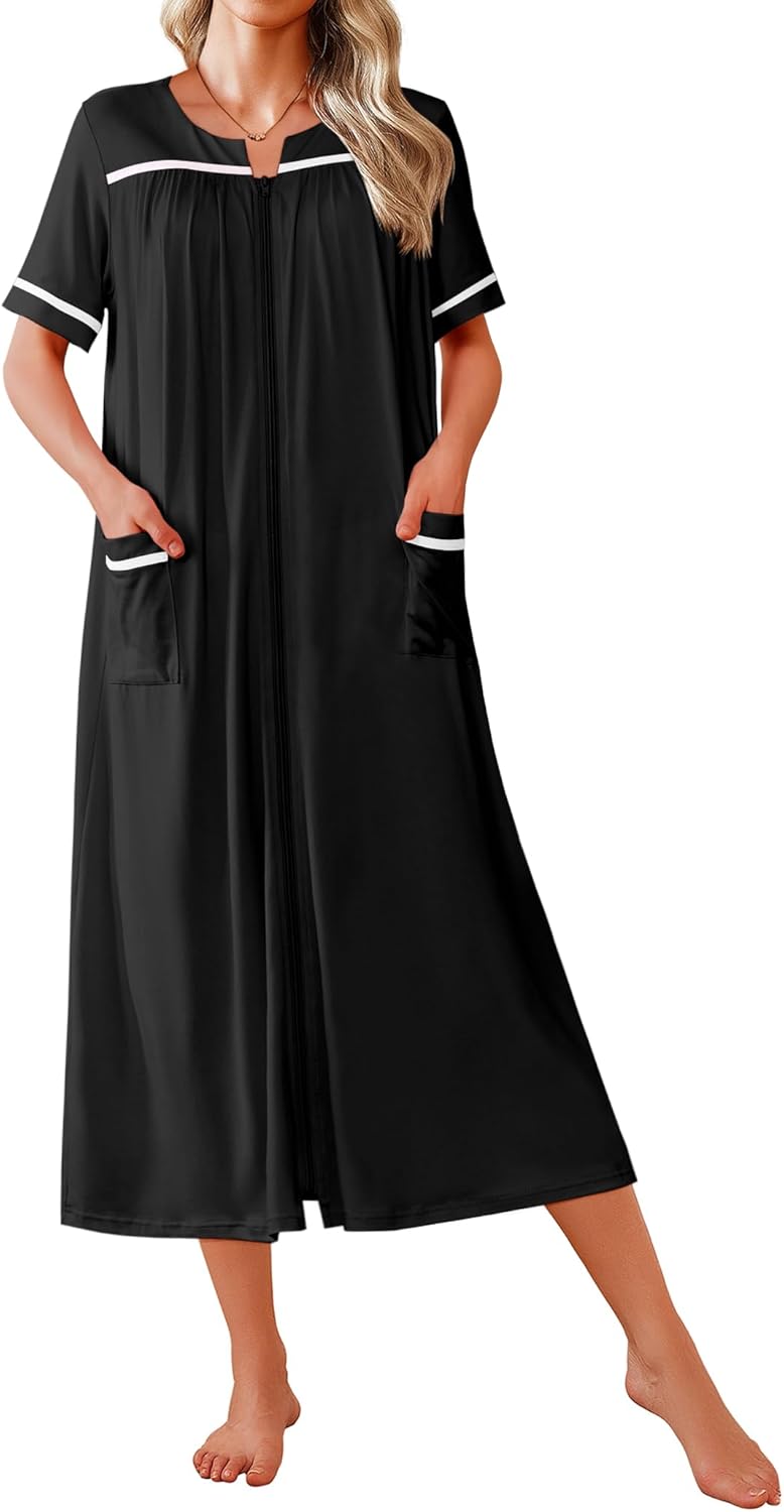 Ekouaer Women Zipper Robes Knit Short Sleeve House Coat Soft Bathrobe Full Length Housecoat Dressing Gown with Pockets