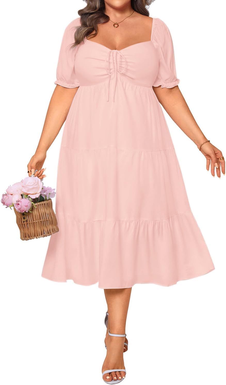 Plus Size Summer Dresses - Sweetheart Neck Drawstring Puff Sleeve Casual Wedding Guest Tiered Aline Flowy Midi Dress