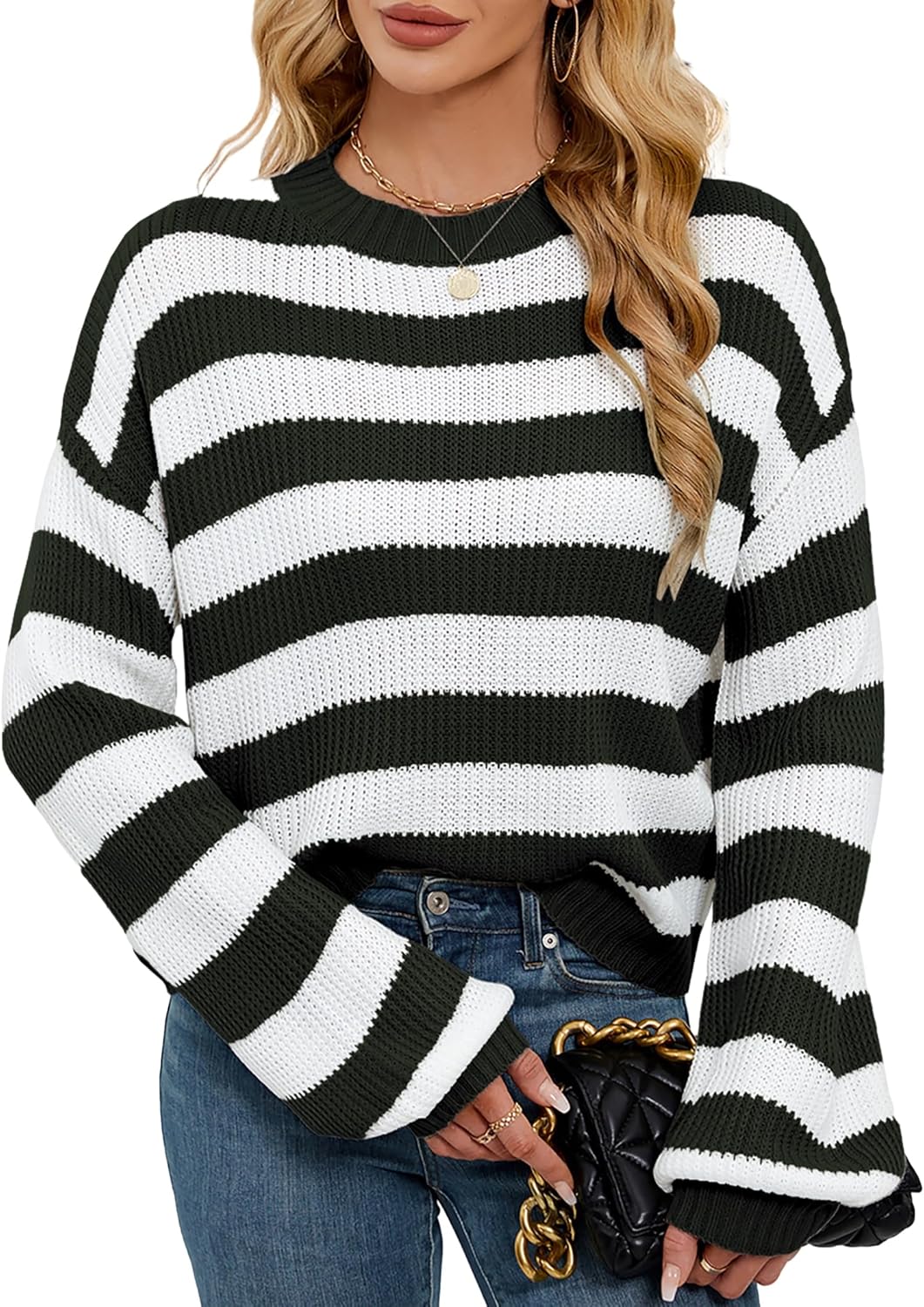 Womens Oversized Lightweight Cute Striped Cropped Sweater Spring 2025 Knitted Crew Neck Thin Crop Pullover Tops