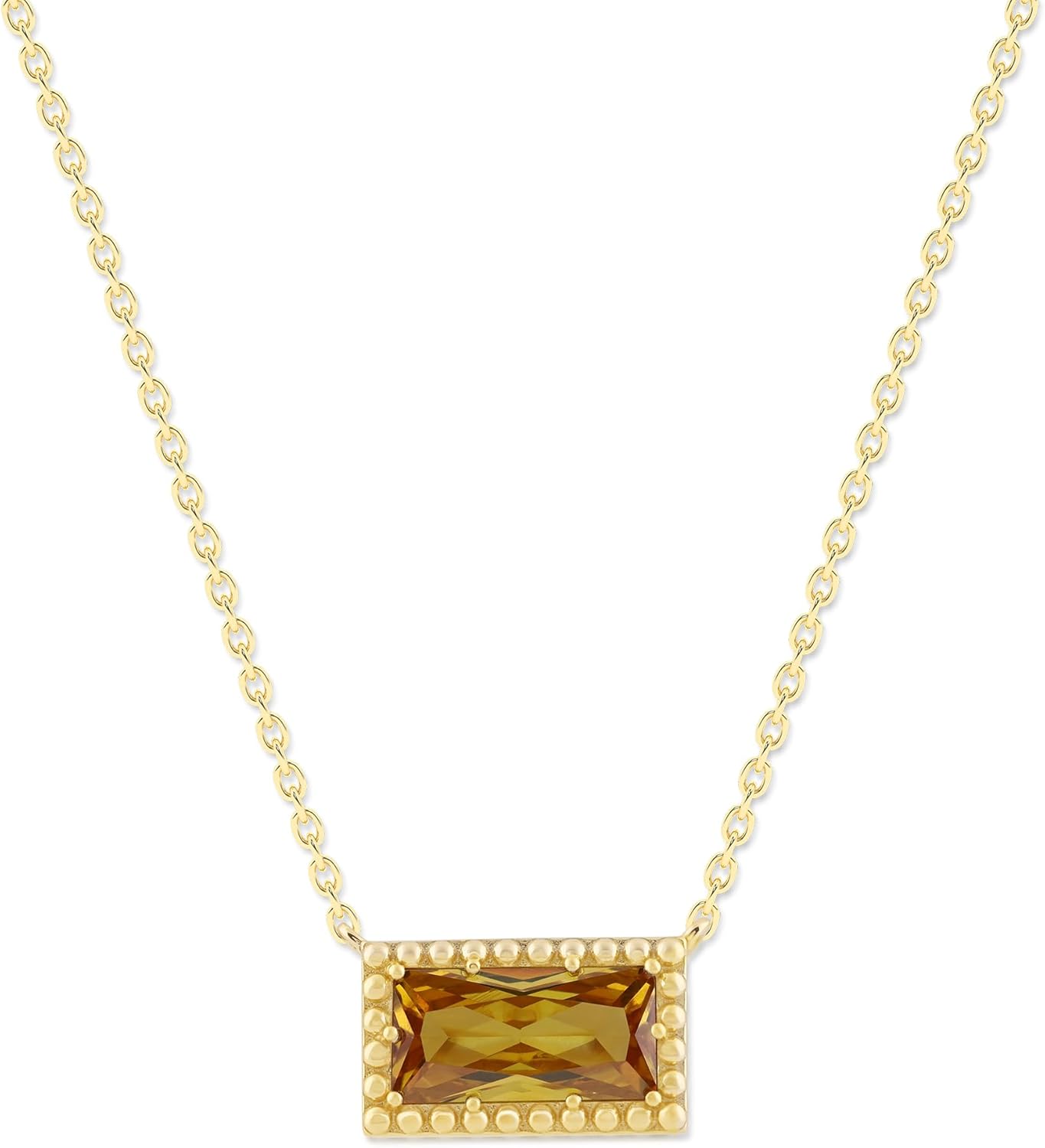 Belacqua Gemstone Necklace in 14K Gold Plated Sterling Silver, Baguette Pendant Size 6*12mm, 15" Cable Chain with 2" Extender, Spring Ring Clasp, Dainty Birthstone Necklace for Women, Gift Box Included
