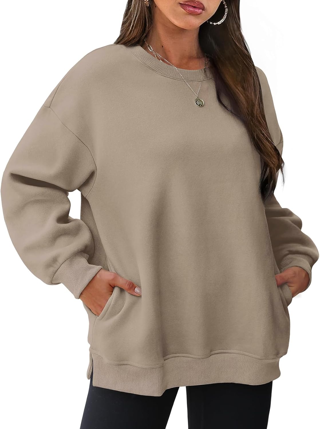 Womens Crew Neck Oversized Sweatshirt with Pockets Long Sleeve Pullover Cotton Hoodies Casual Tops Winter 2025