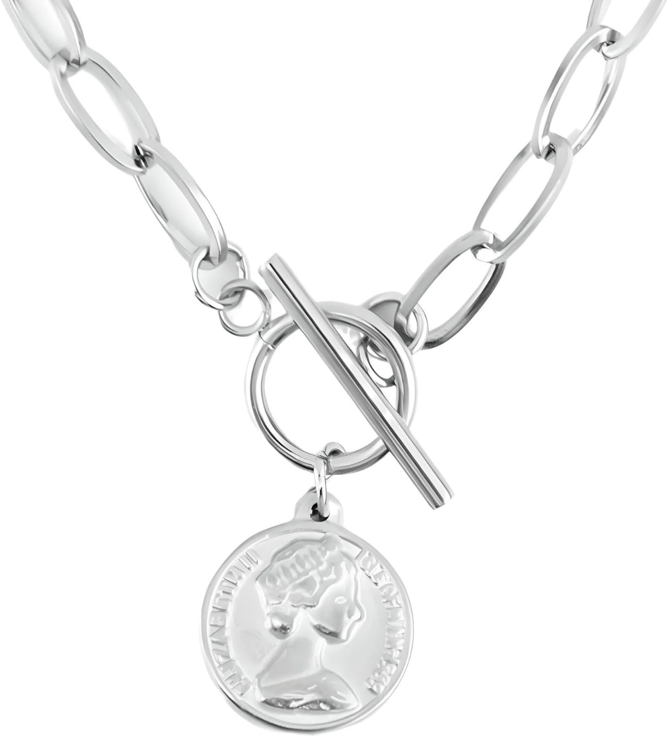 14K Yellow Gold Coin Toggle Necklace For Women - 925 Sterling Silver Minimalist Toggle Necklace, Coin Pendant Thick Link Chain Layered Necklaces, Perfect Gifts