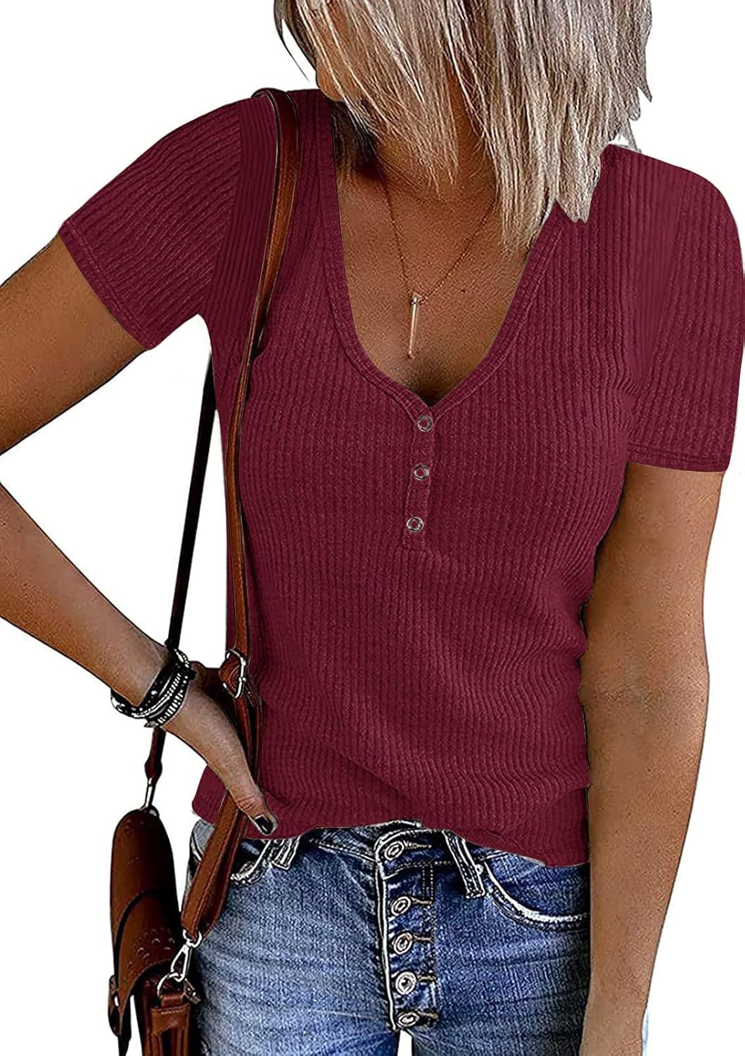 MEROKEETY Women's 2026 Summer Short Sleeve Tops Casual V Neck T Shirts Ribbed Knit Henley Button Basic Blouse