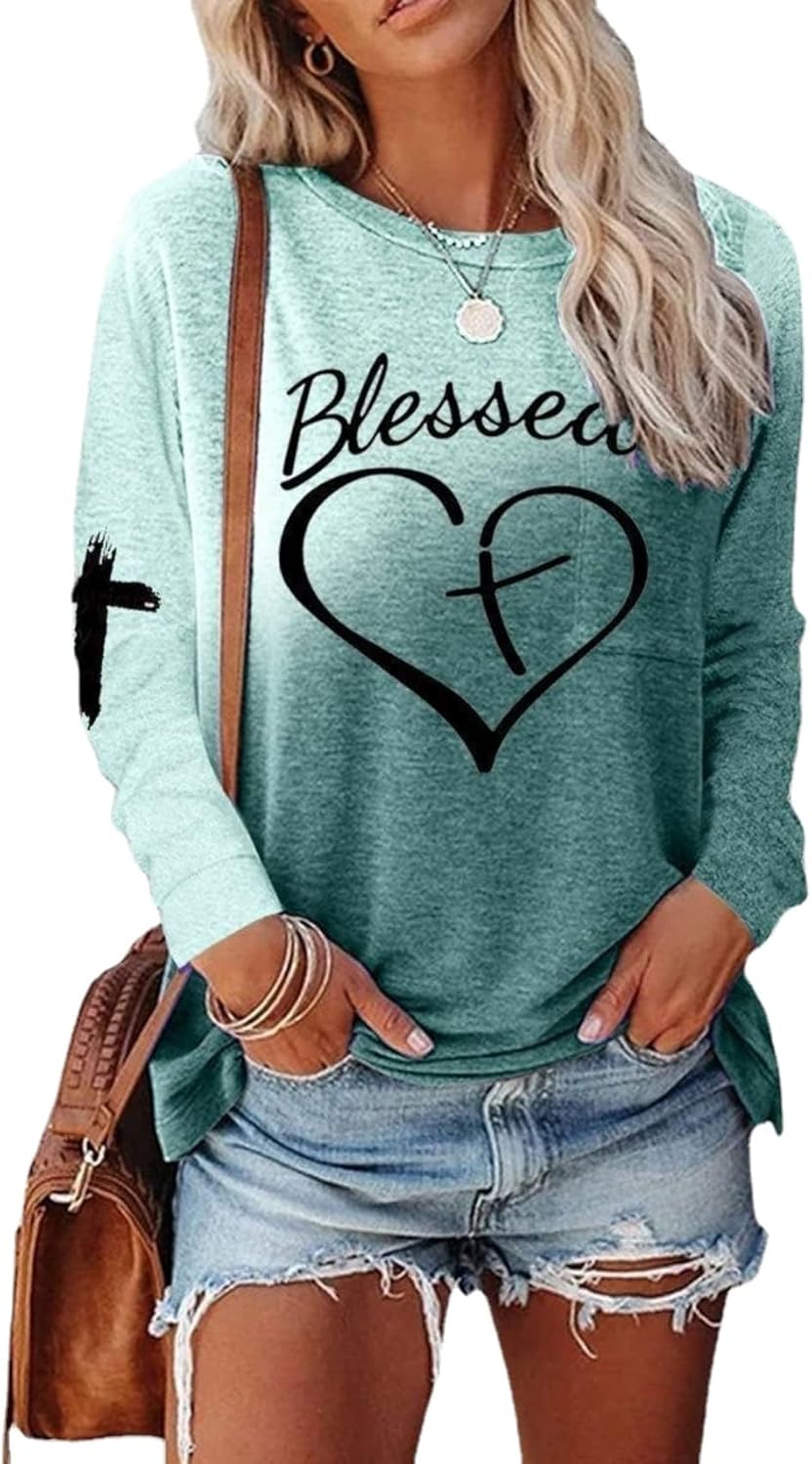 Women's Blessed Letter Print Long Sleeve Tshirt Casual Oversized Faith Jesus Love Cross Creneck Pullover Top