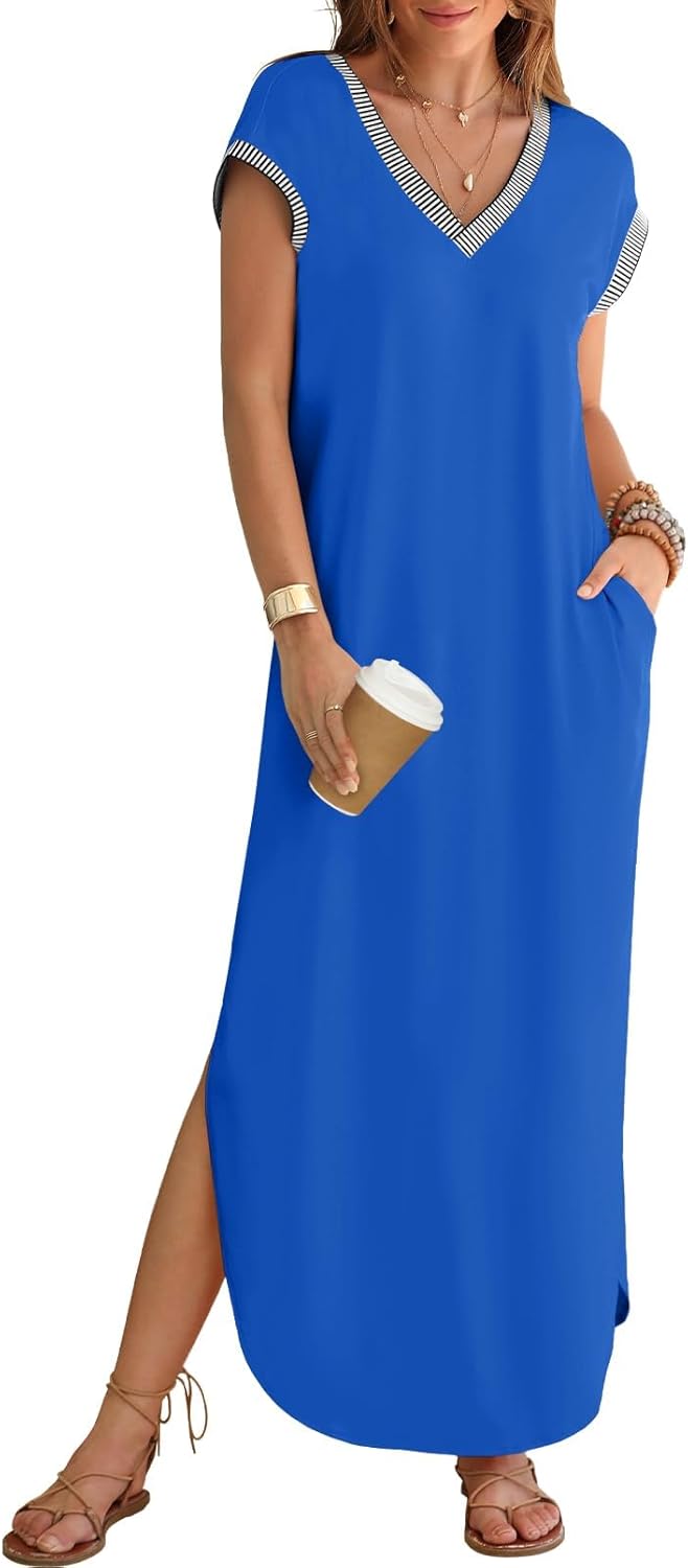 MEROKEETY Women's 2025 Spring Summer Maxi Dress Casual V Neck Split Beach Vacation Loose Long Dresses