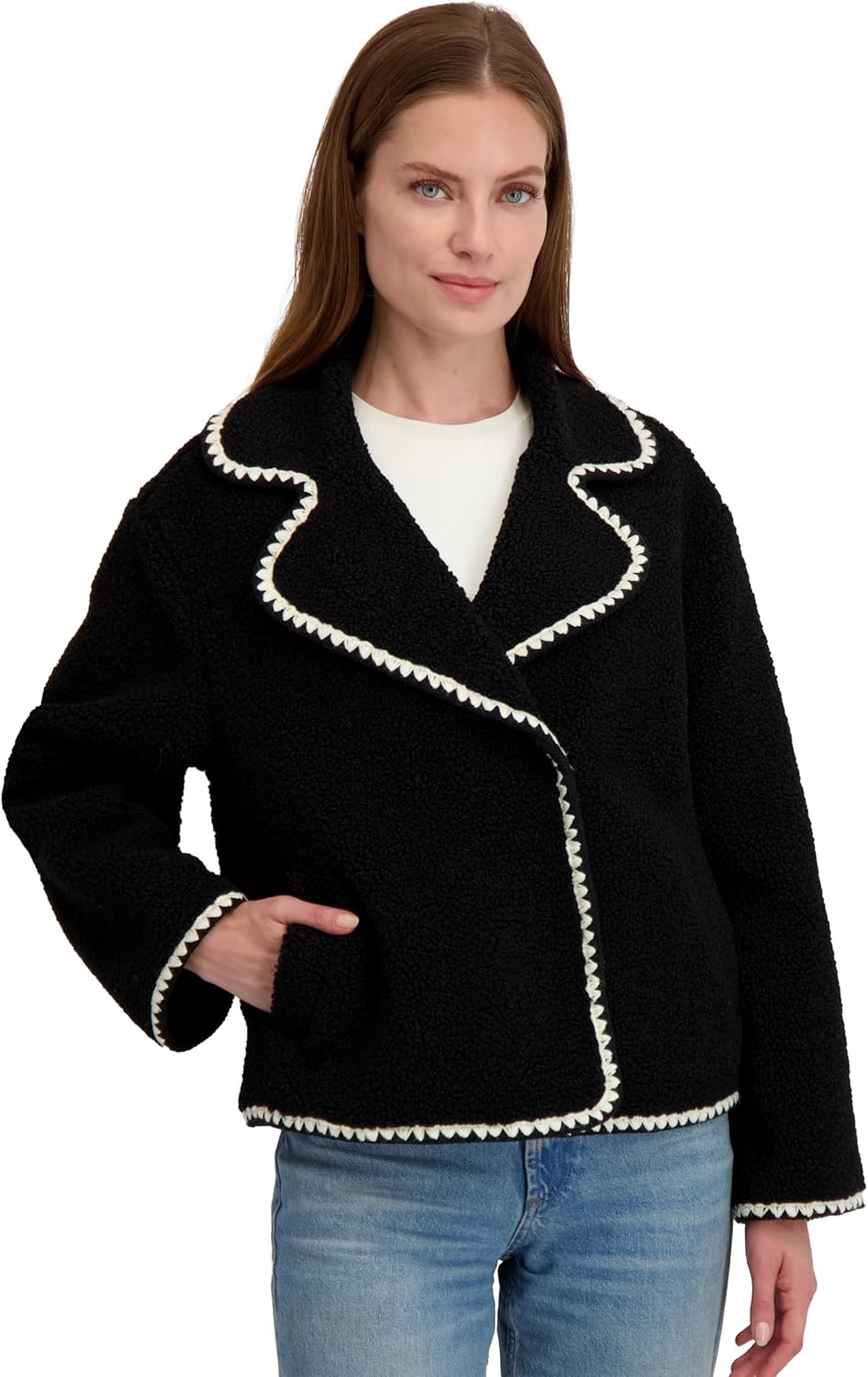 Laundry by Shelli Segal Women's Short Faux Sherpa Jacket –cropped Coat With Curved Collar, Hidden Snap Closure