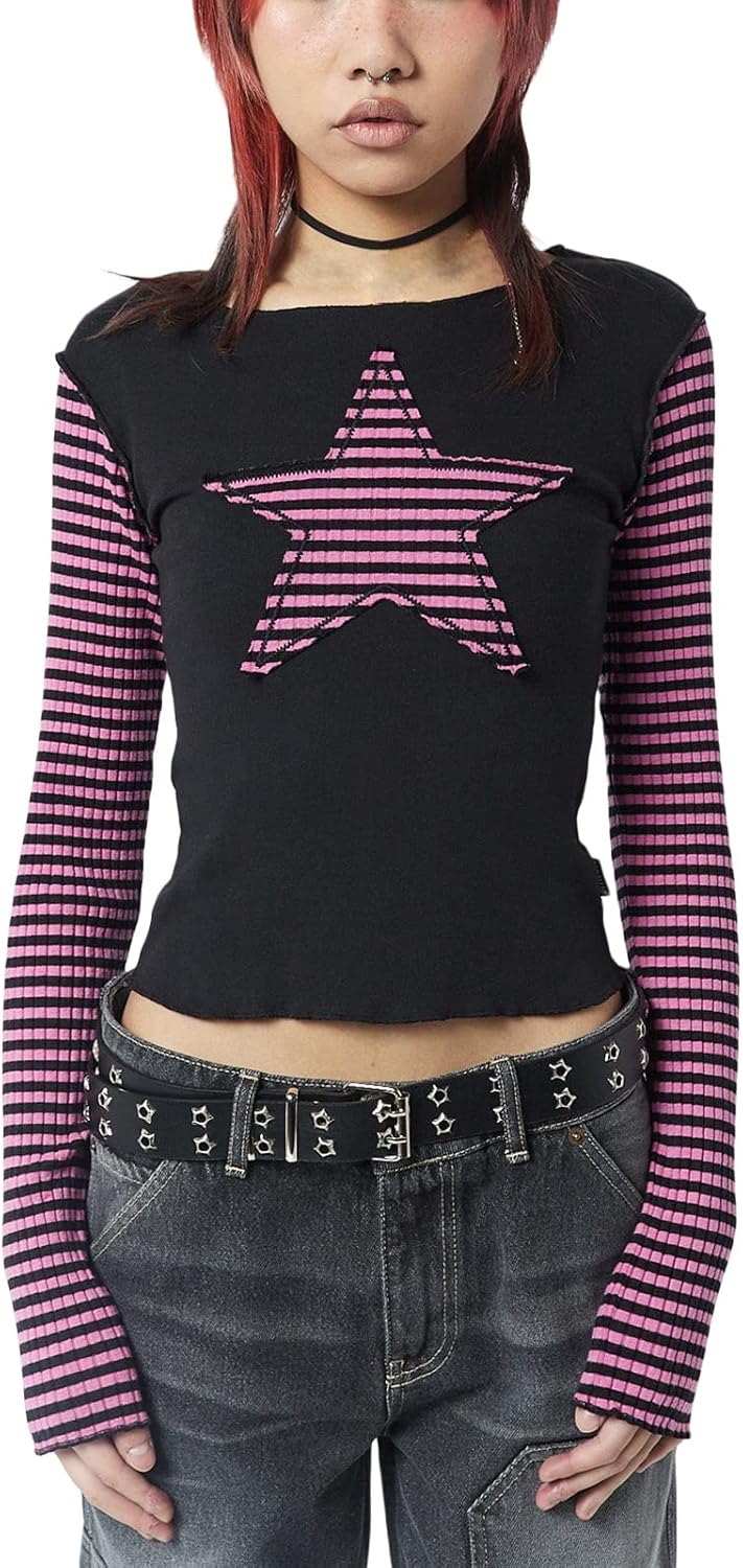 Women Y2K Fairy Grunge Shirt Long Sleeve Vintage Star Pattern Stripes Patchwork T Shirts