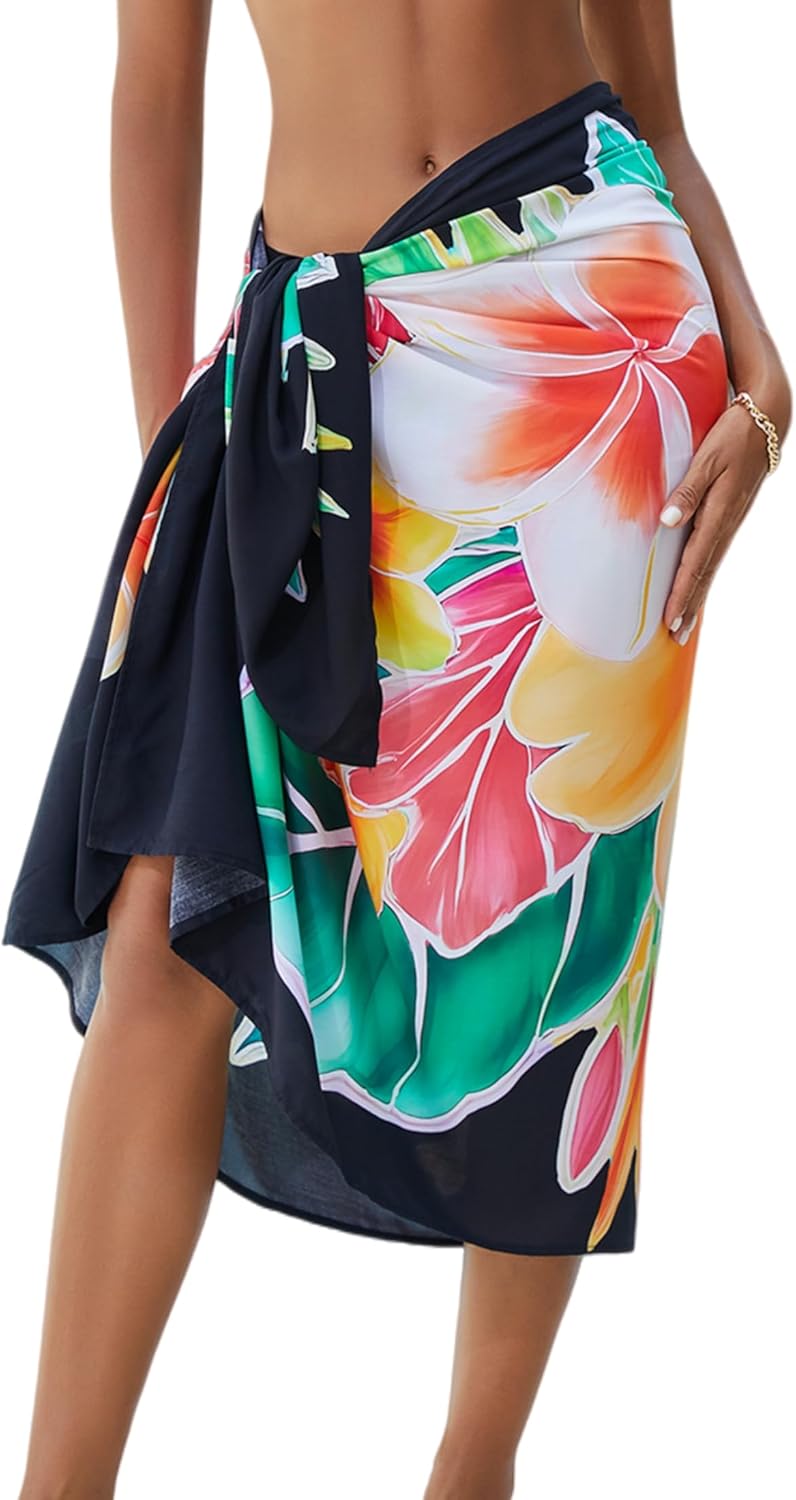 Women Swimsuit Sarong Beach Cover Up High Slit Printed Wrap Skirt for Bikini Swimwear, Summer Vacation and Party