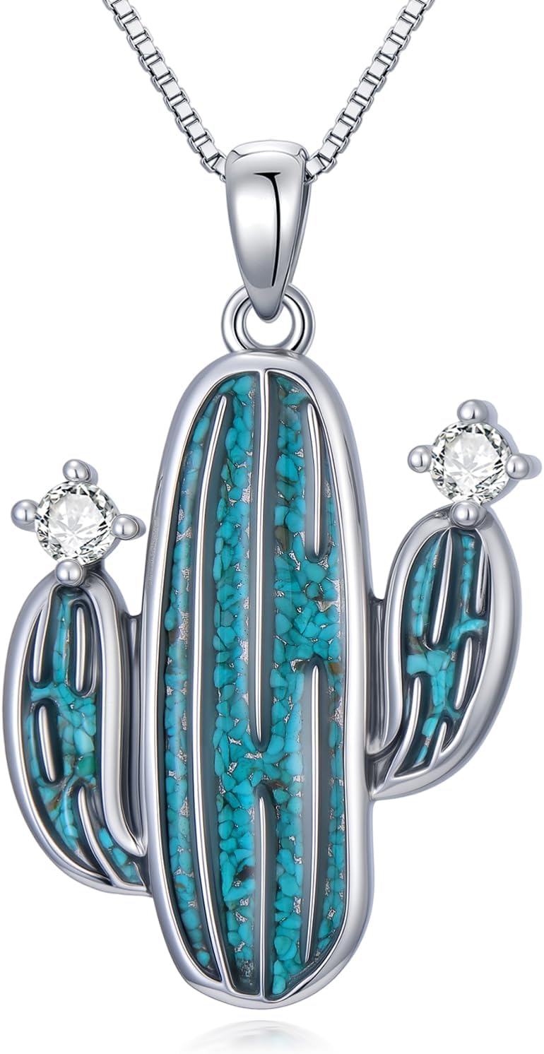 Genuine Turquoise Cactus Necklace,925 Sterling Silver Native American Boho Western Pendant Real Gemstone Jewelry Birthdays Gift for Women Men Nature Lover