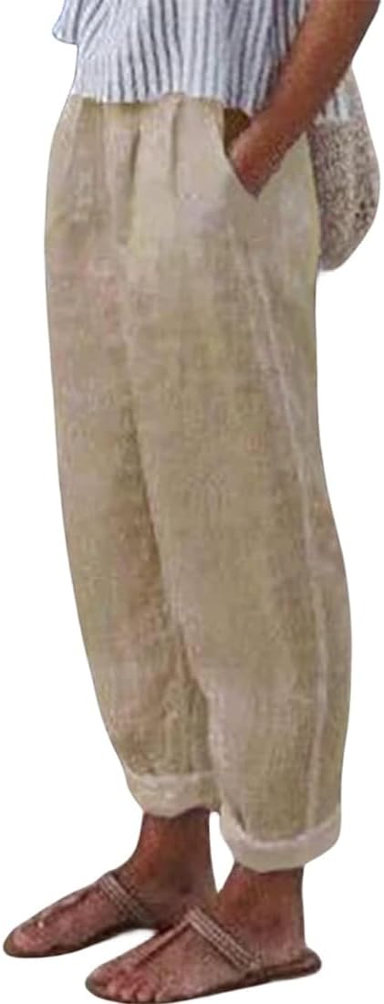 ZOCANIA Cotton Linen Pants for Women Floral Printed Beach Pants Elastic Waist Cropped Trousers Boho Pants with Pockets