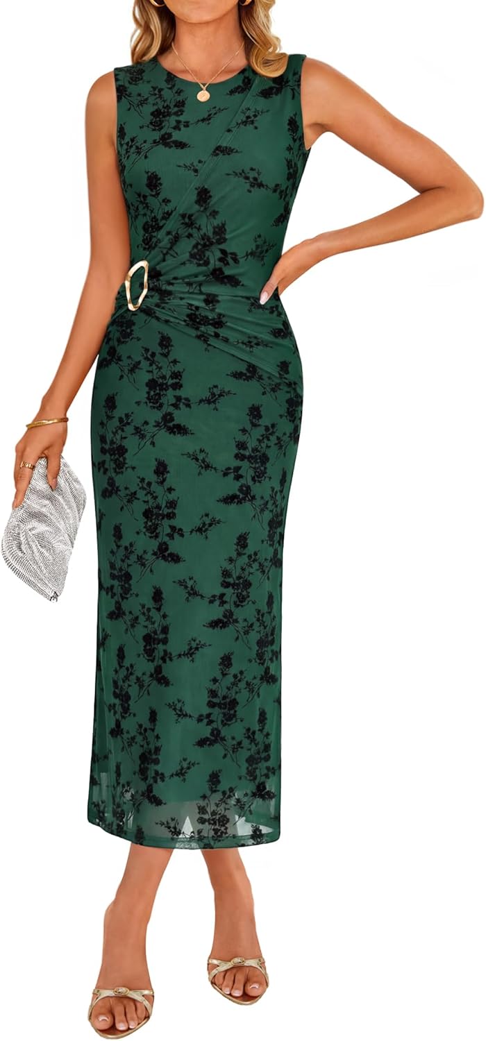 ZESICA Women's Summer Sleeveless Floral Bodycon Midi Dress 2026 Ruched Mesh Wrap Wedding Guest Cocktail Party Long Dresses