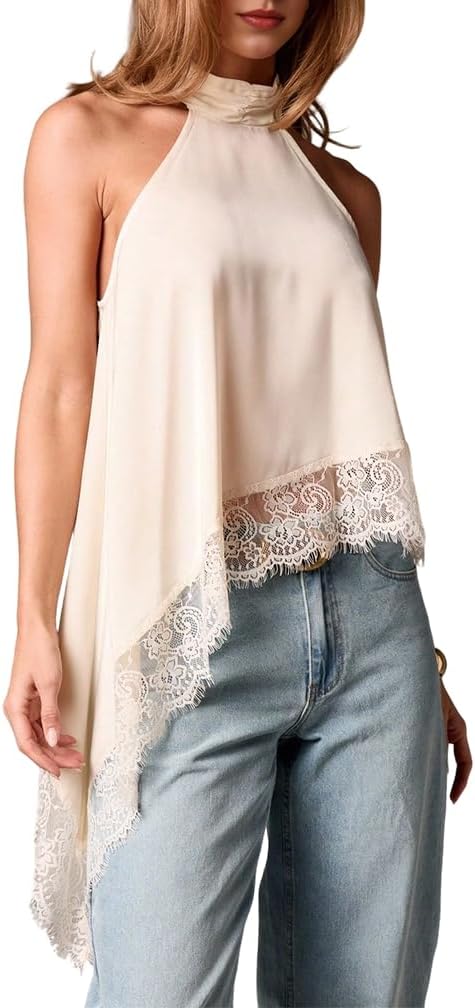 Women Y2k Satin Sleeveless Mock Neck Lace Trim Tank Top Elegant Backless Asymmetric Hem Going Out Halter Tops