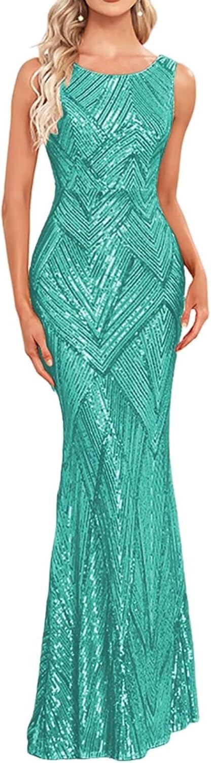 Sparkly Sequin Long Formal Evening Dresses for Women Mermaid Bodycon Boat Neck Prom Party Cocktail Dress