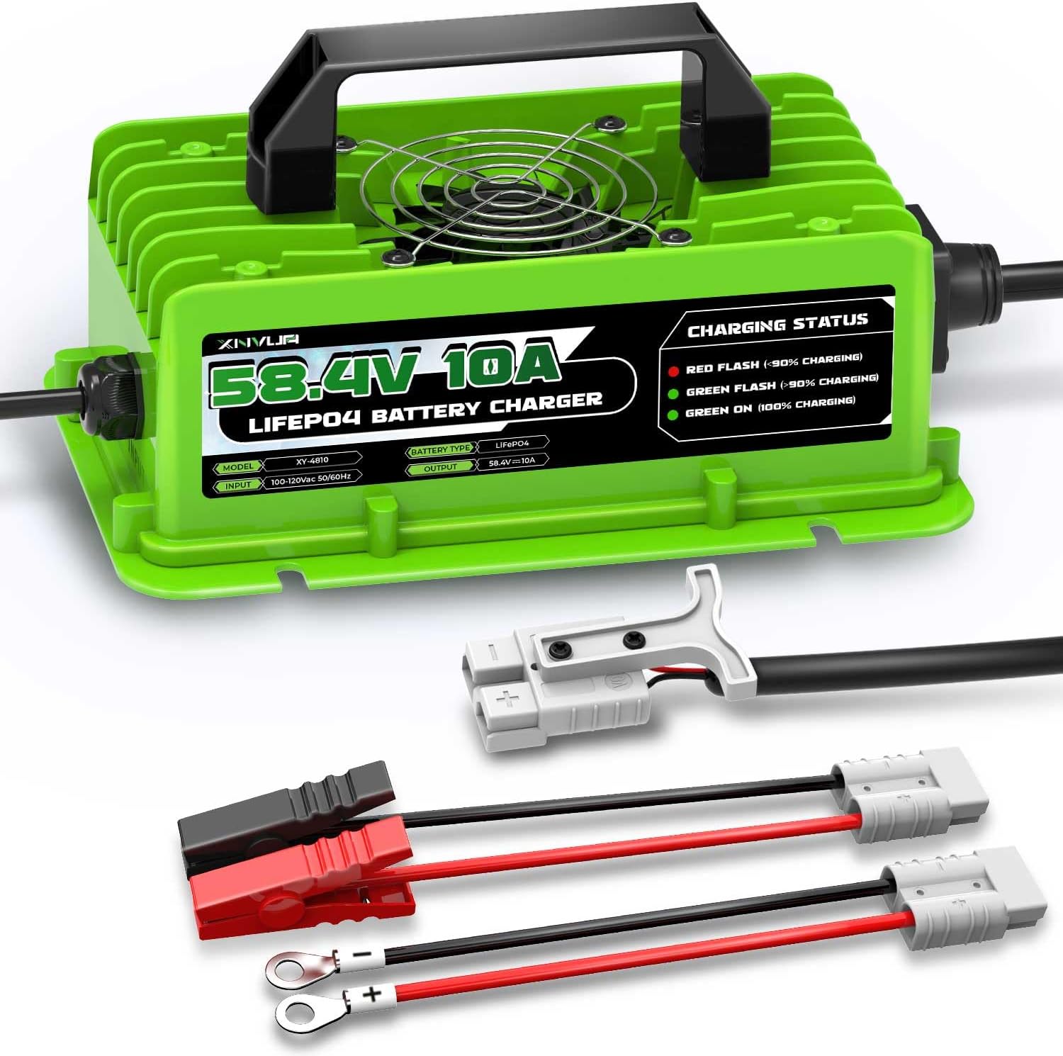 - 【Easy Operation】58.4V 10A lithium battery charger upgraded the connection between the charger and the battery with an M8 terminal and alligator clips, and added a Anderson connector for customer convenience. We have kept the cooling fan to enable the charger to charge more efficiently.