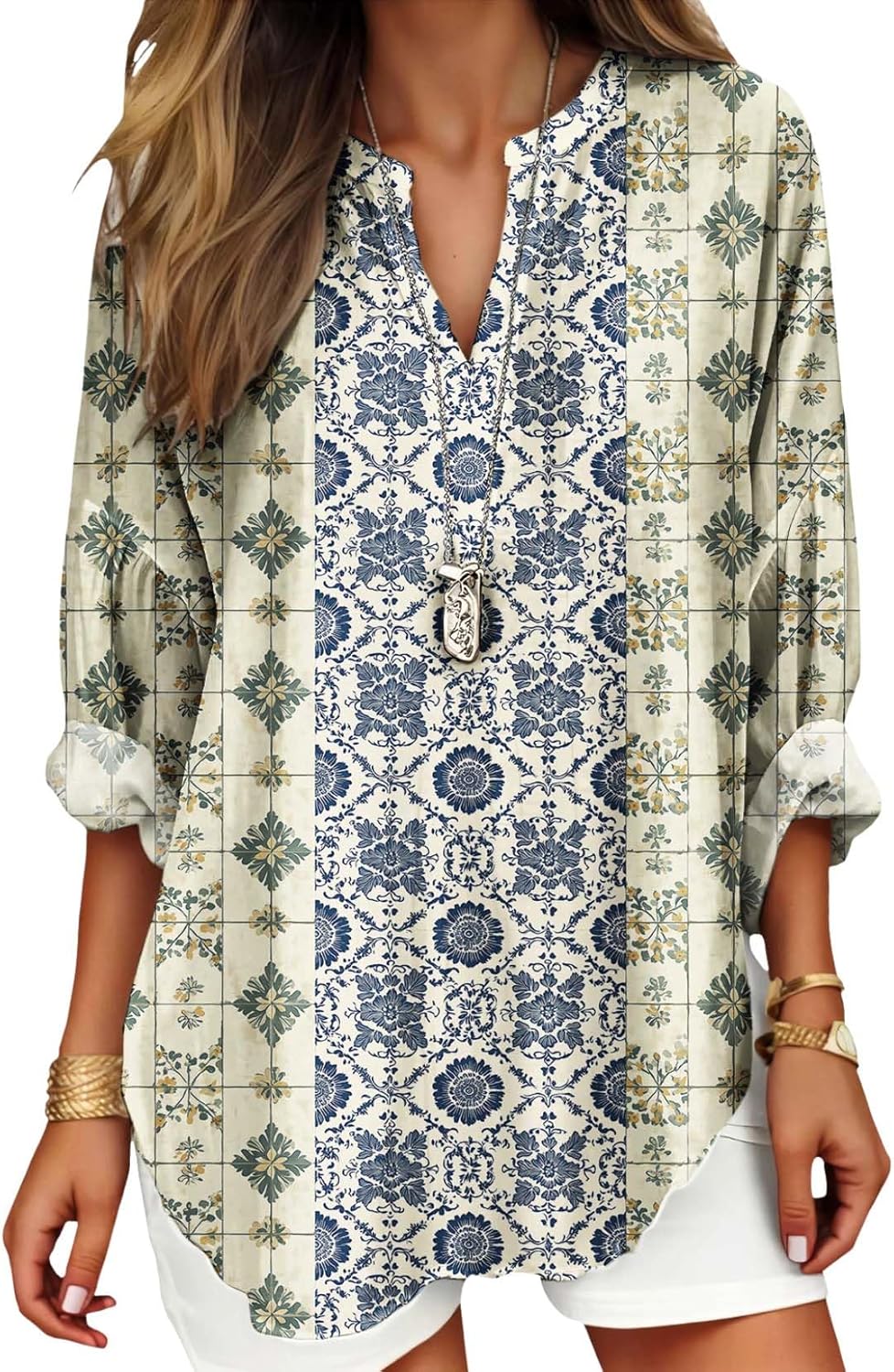Womens Boho Floral Printed Shirts Long Sleeve V Neck Blouses Casual Plus Size Vacation Tunic Tops for 2025 Autumn