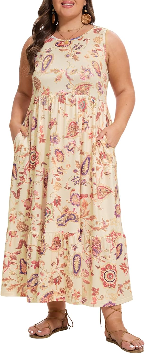 Moon Wood Women's Plus Size Sleeveless Summer Dress Crewneck Tank Casual Flowy Maxi Dress with Pockets Vacation Outfits