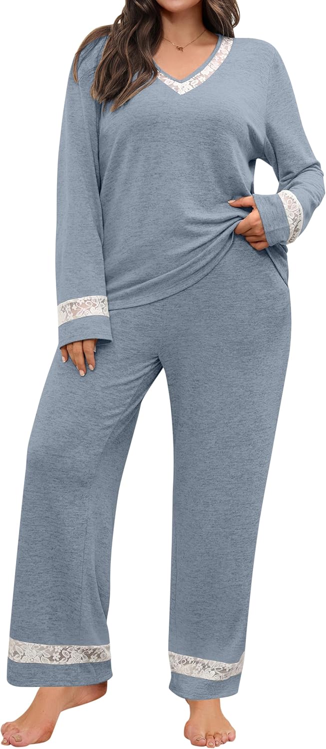 Blooming Jelly Women Plus Size Pajamas Sets Cute Lace Lounge Set Long Sleeve Pj Sets V Neck Loungewear Fall Outfit