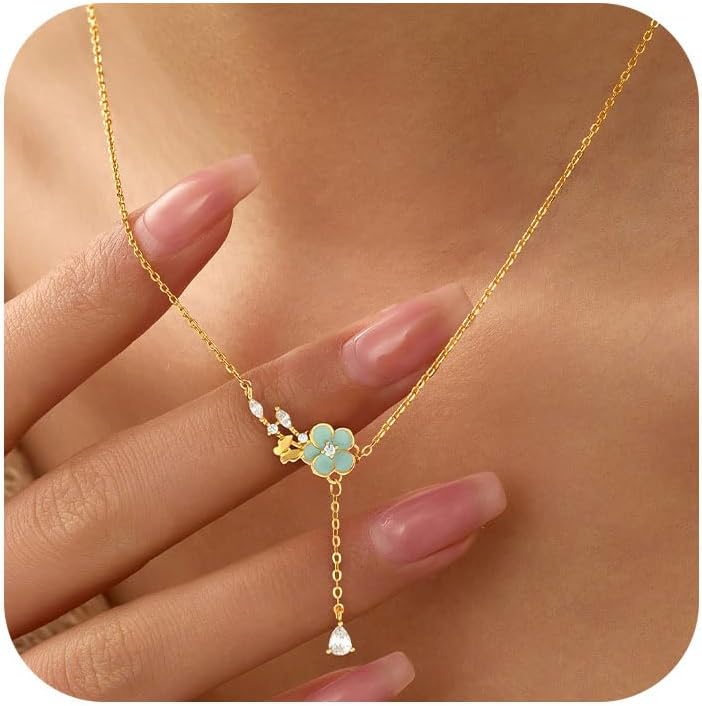 925 Sterling Silver Dainty Cherry Blossom Flower Leaf Necklaces for Women Light Green Flower CZ Butterfly Charm Chain 14K Gold Plated Birth Month Enamel Floral Pendant Necklace Easter Jewelry Gifts for Her