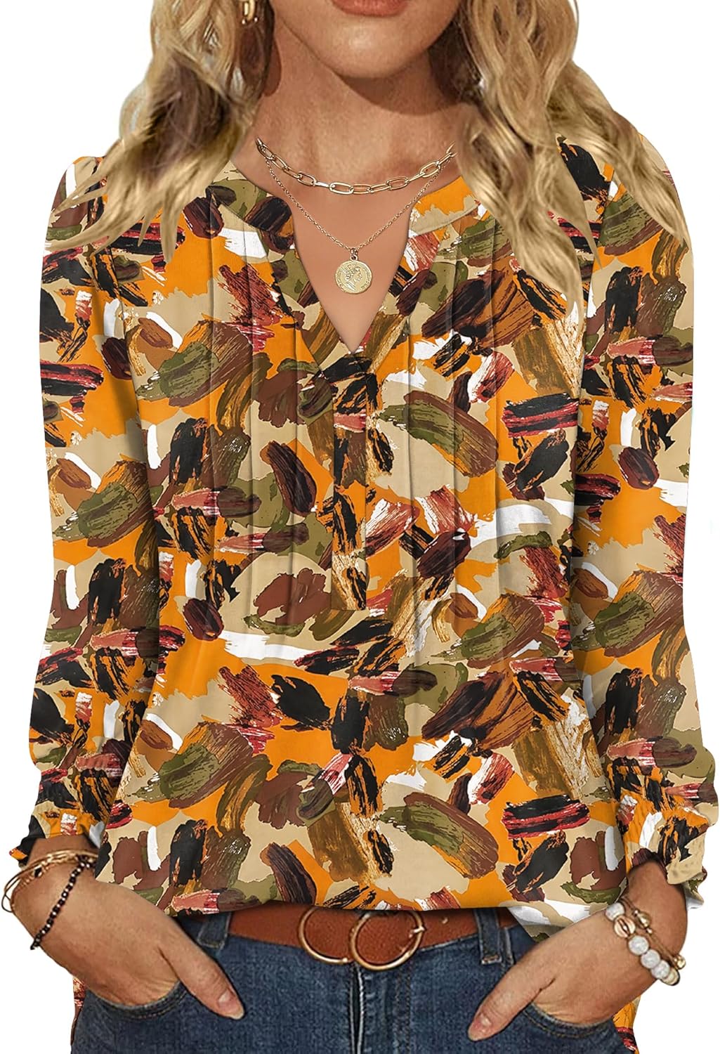 LOMON Womens Tops Dressy Casual Pleated Ruffle Long Sleeve Tunics Tops to Wear with Leggings V Neck Work Blouse