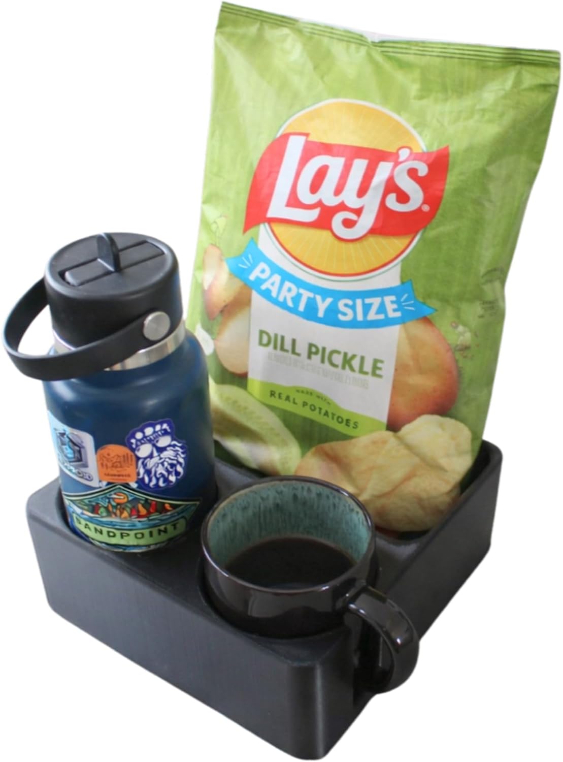 - FITS LARGE BOTTLES & MUGS: Designed with two oversized drink slots to accommodate large reusable water bottles like Hydro Flask or Nalgene, and coffee mugs, includes handle slot for comfortable placement and easy access