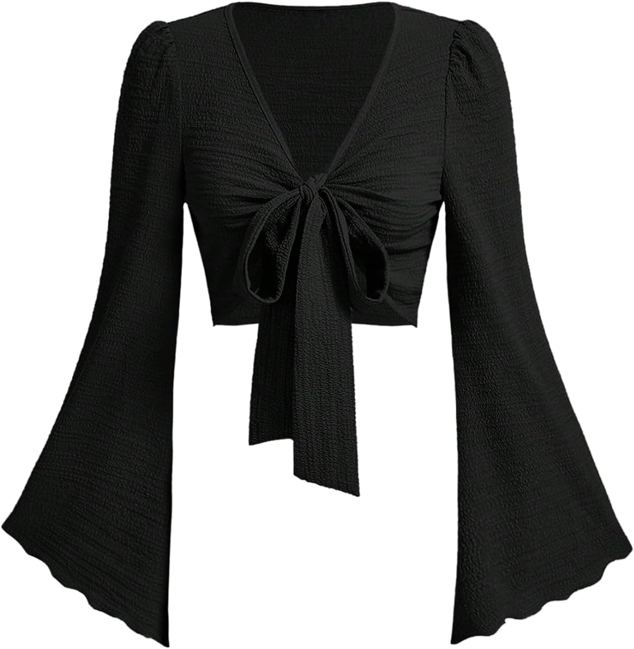 SHENHE Women's Bell Long Sleeve Tie Front Top Knotted V Neck Fairy Going Out Crop Top Blouse
