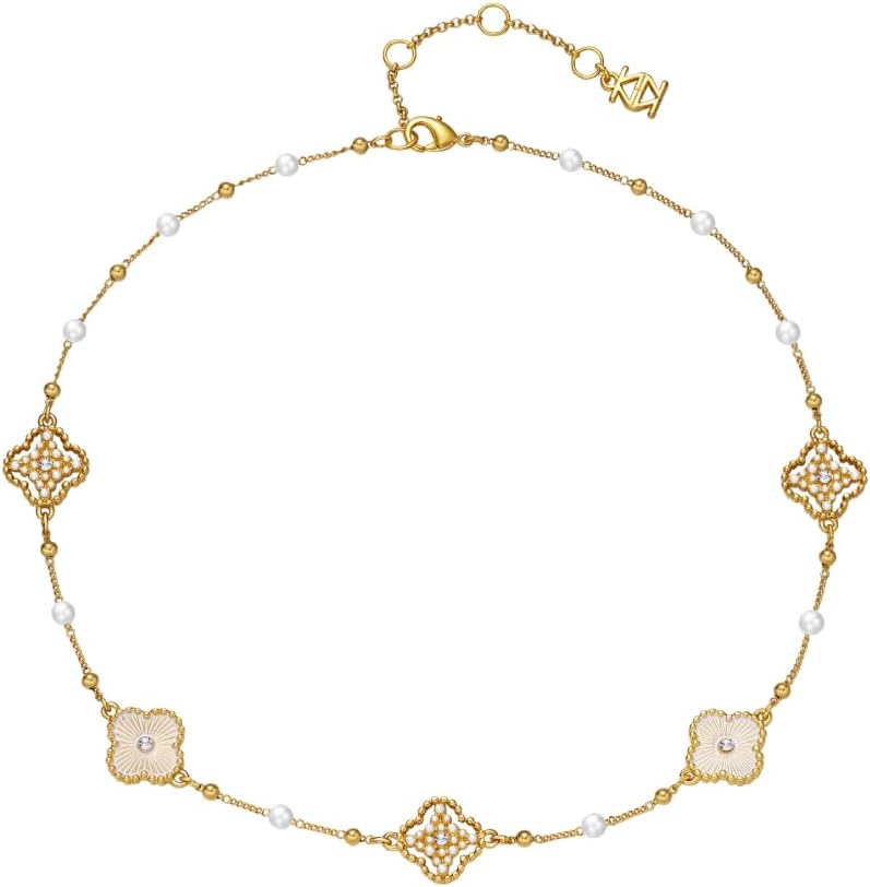 14K Gold Plated Four-Leaf Clover Pearl Necklace, Lucky Jewelry - Layered and Stacked Design, Size 18 Inches, Suitable for Daily Wear and Gift Selection, Suitable for Both Men and Women