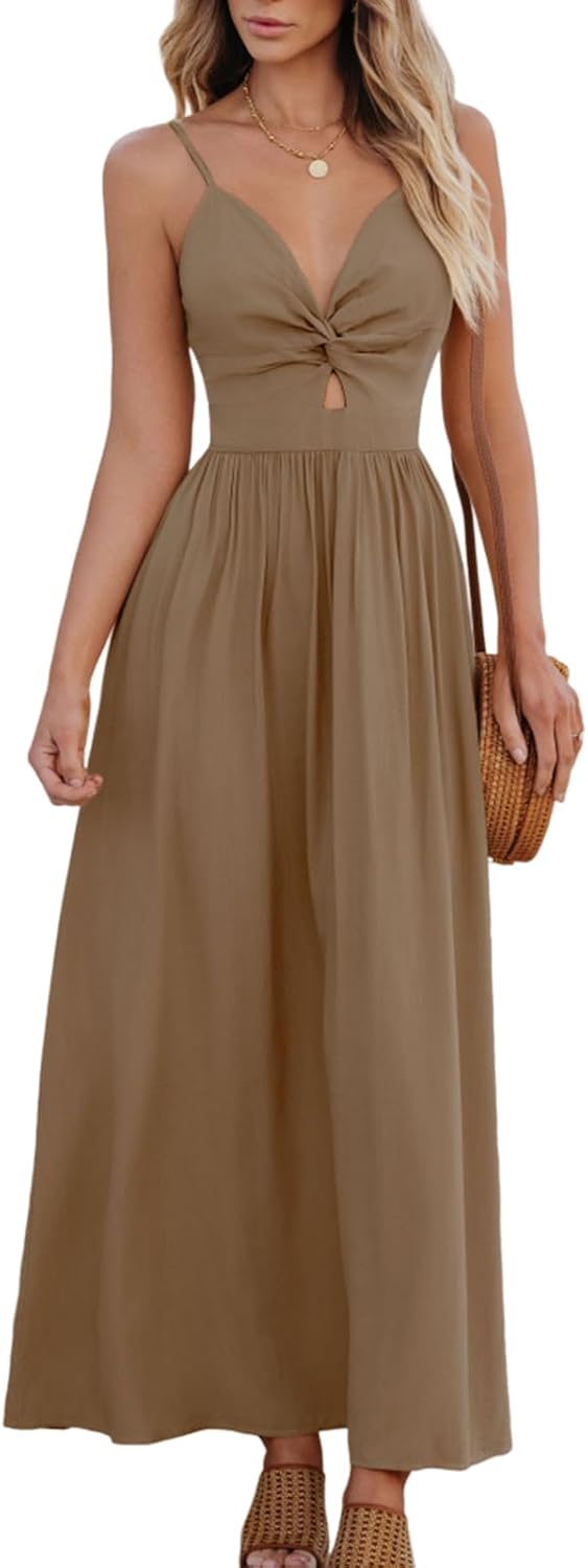 CUPSHE Women Casual Dress Beach Sleeveless V Neck Summer Cutout Spaghetti Straps Formal Maxi Sun Dresses