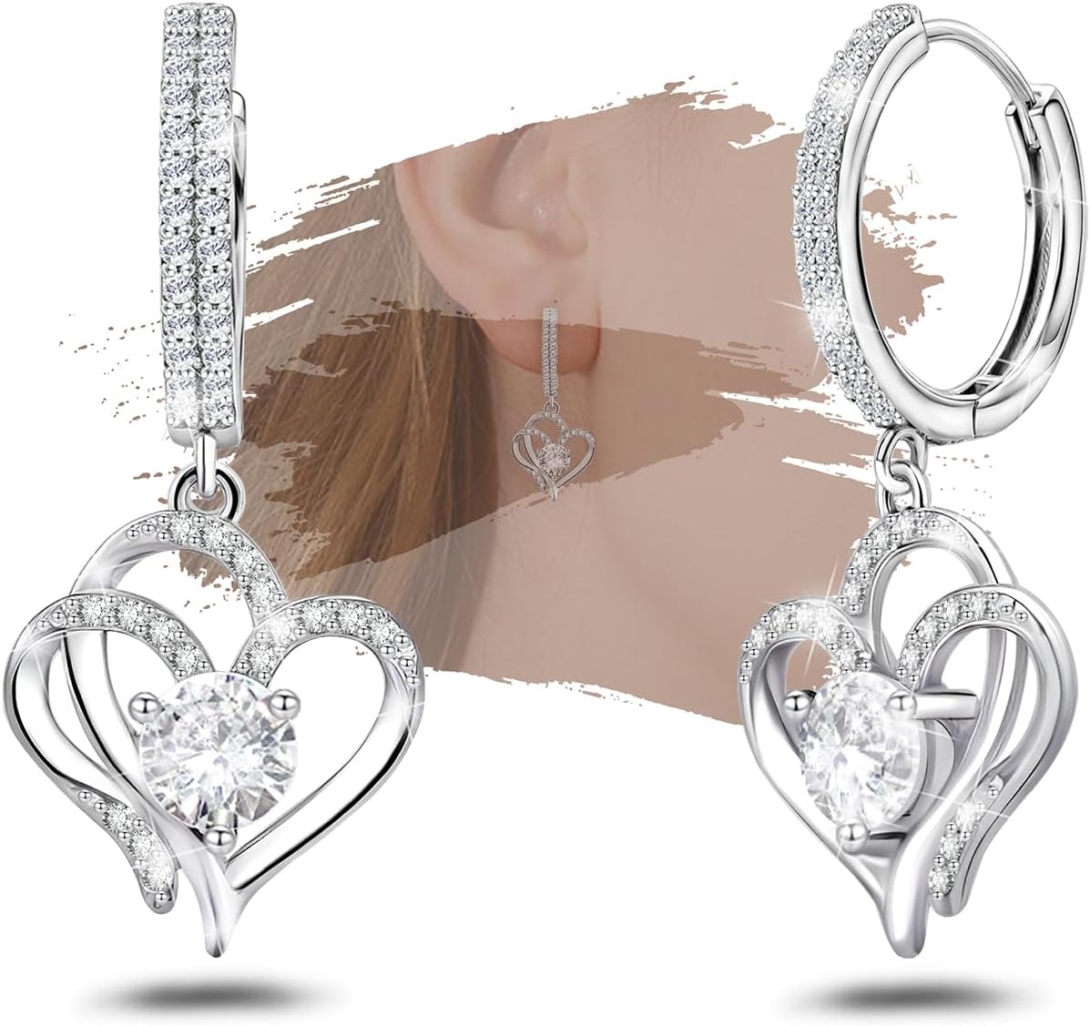 Sterling Silver Heart Earrings - Sparkling Cubic Zirconia Hypoallergenic Love Heart Dangle Hoop Earrings Elegant Gifts for Her Mom Wife
