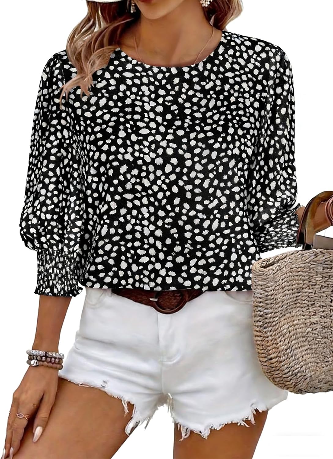 Halife Womens Blouses 3/4 Sleeve Dressy Tops Business Casual Crew Neck Smocked Cuffed Shirts