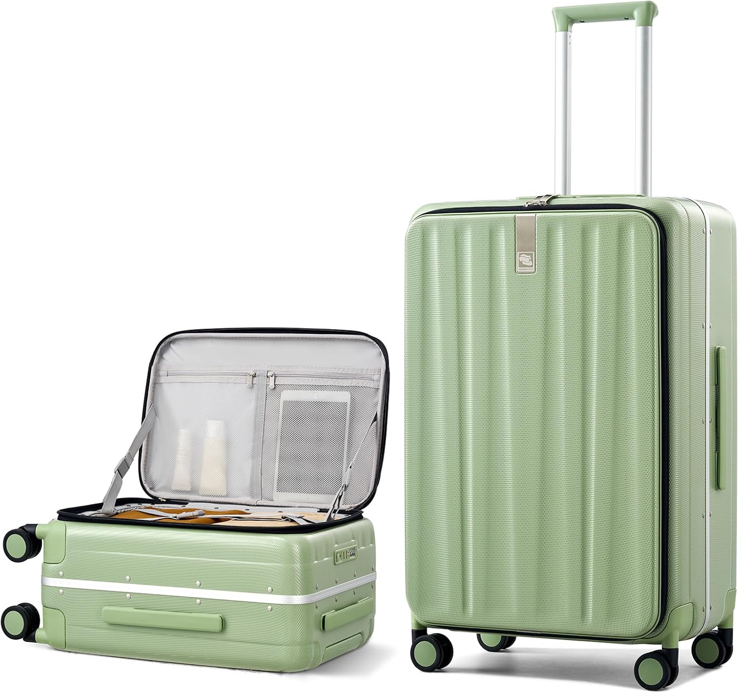 - 【CREATIVE FRONT OPENING】This trunk luggage with spinner wheels Leading the future opening and closing method which is effortless to open or close the suitcase, not only is it easy to load, but it also saves space. This design solves the problem that traditional luggage separated 2 compartments of heavy load then it's difficult to open and close. Importantly, it also avoid the displacement of items.
