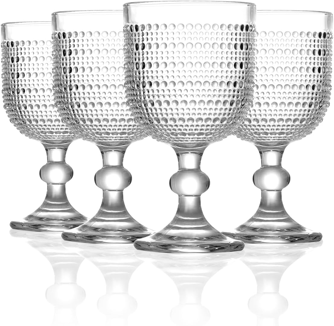12 oz Clear Vintage Wine Glasses,Hobnail Drinking Glasses Set of 4,Embossed Goblet Glasses for Wedding,Party, Dinner,Bar