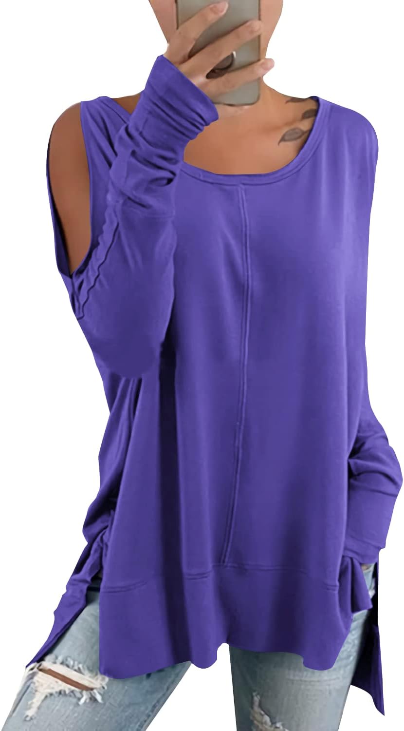 Hongqizo Women's Cold Shoulder Long Sleeve Sweatshirt Casual Crew Neck Side Split Loose Pullover Tops Blouses