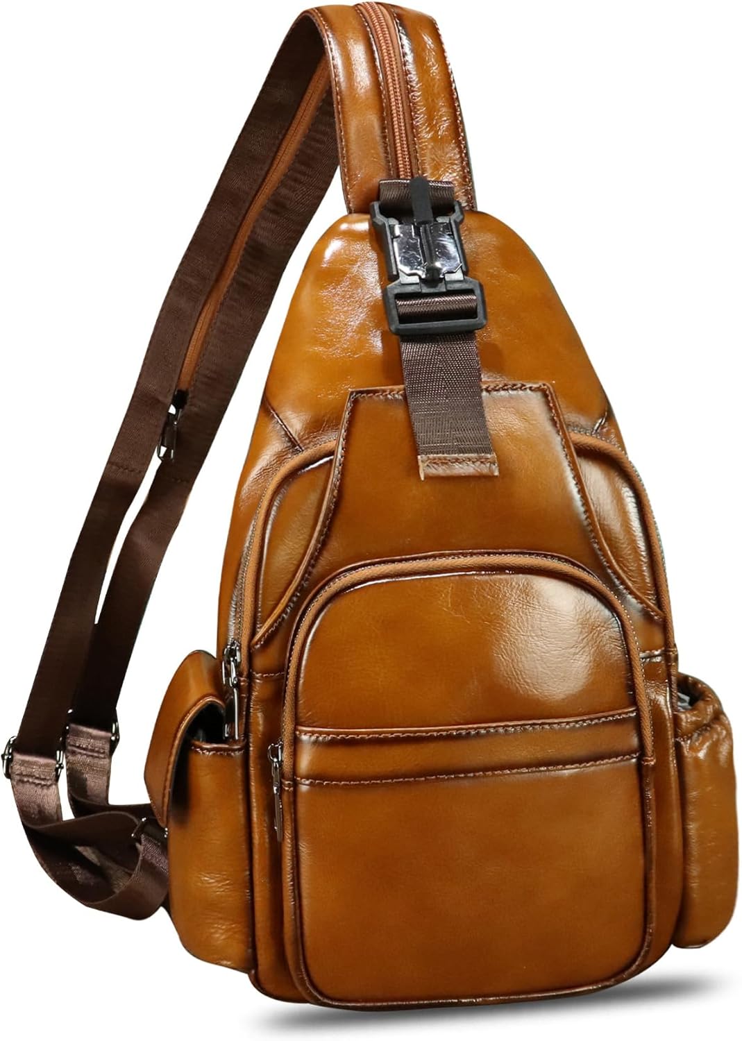 LRTO Genuine Leather Sling Bag for Men and Women Handmade Sling Backpack Purse Chest Over Shoulder Crossbody Bag Large Capacity (Brown)