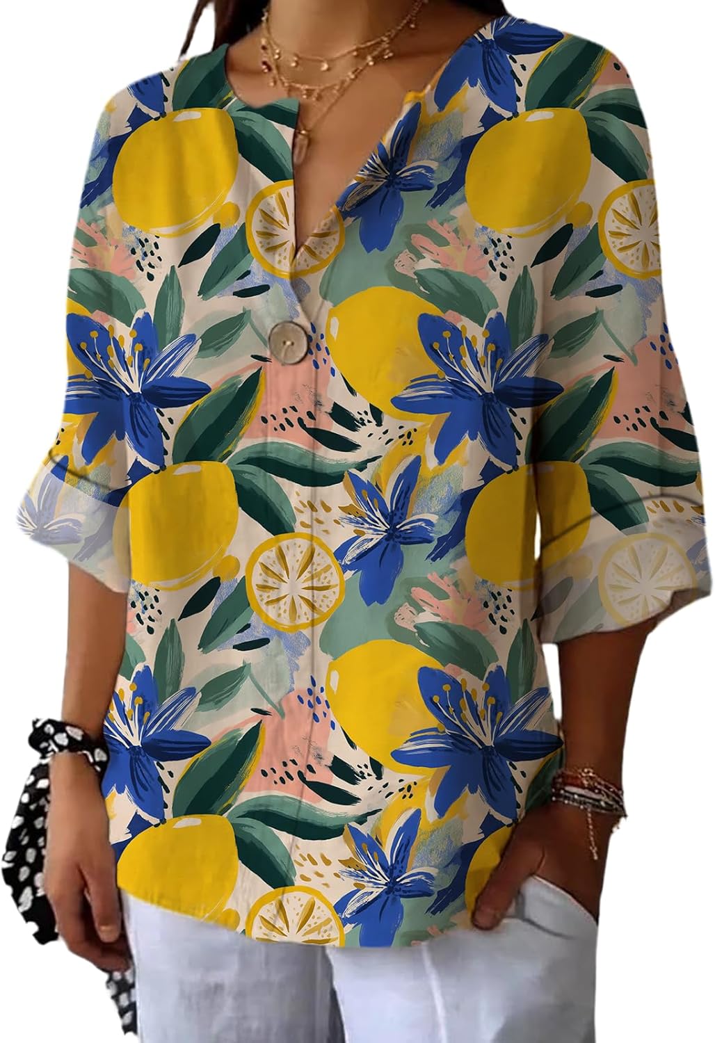90S Shirts Women Vacation Beach Flower Printed T-Shirt Three-Quarter Sleeve V Neck Plus Size Breathable Tees
