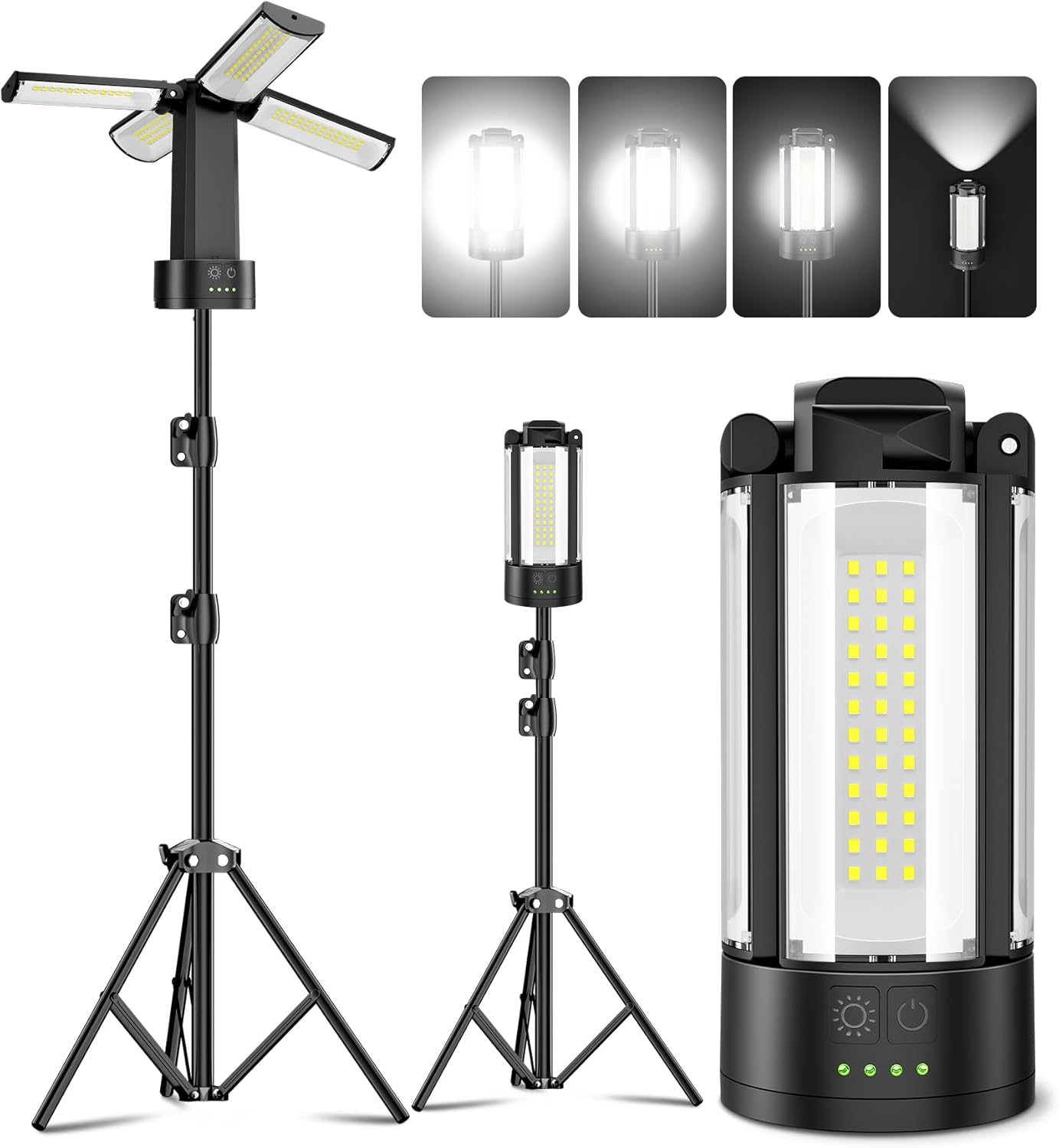 - [Versatile Tripod with Light] Our work light with stand has a tripod with an auto pop-up switch. It offers a height adjustment range of 34.05" to 67.71". Camping lights rechargeable can be bracket or remove the lamp head, the bottom magnetic design can be easily adsorbed, also can be hanging