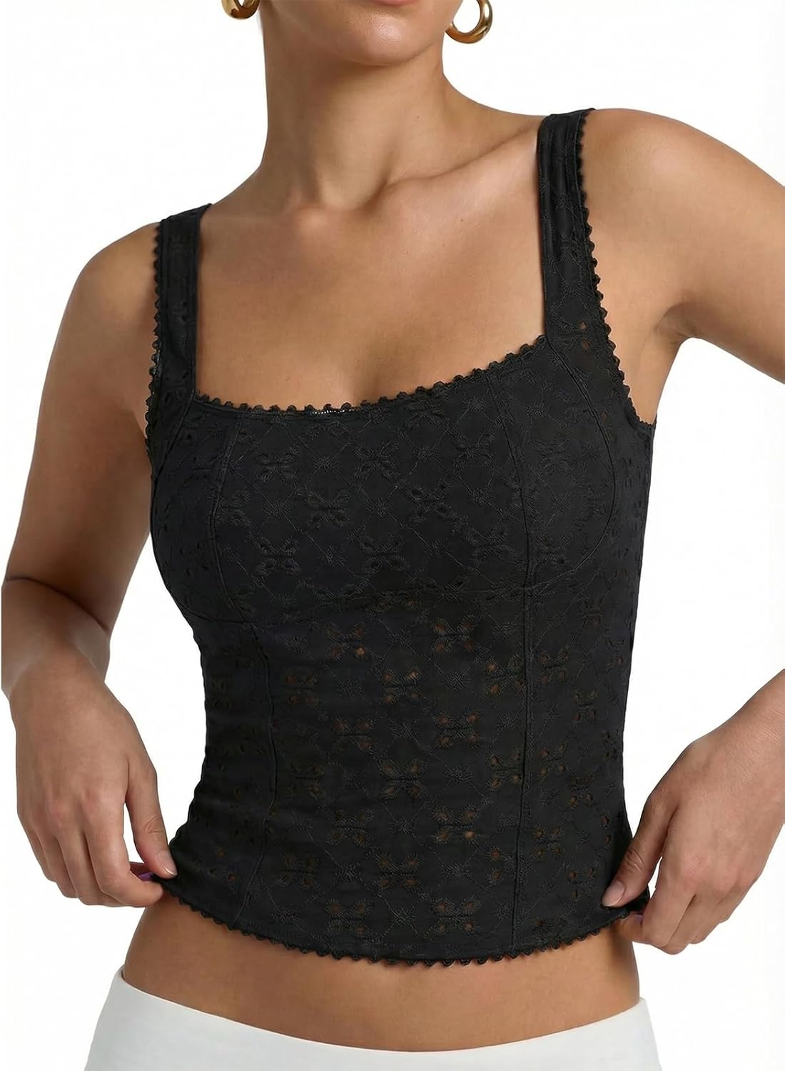 Women's Sexy Square Neck Eyelet Hollow Out Sleeveless Back Cutout Y2K Going Out Double Lined Cropped Tank Tops