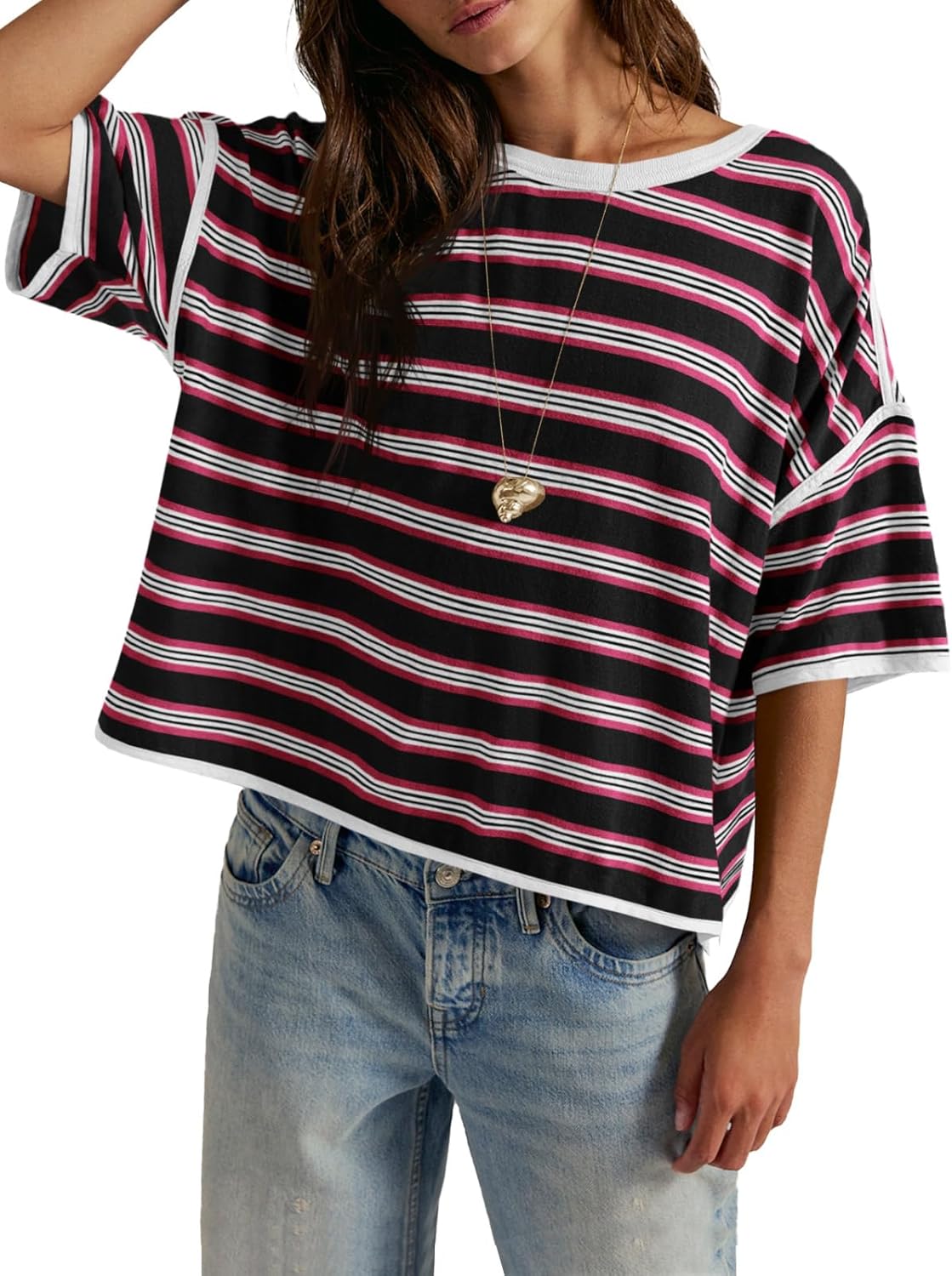 Tankaneo Womens Oversized Striped T-Shirts Summer Casual Color Block Short Sleeve Tops Drop Shoulder Boxy Tees