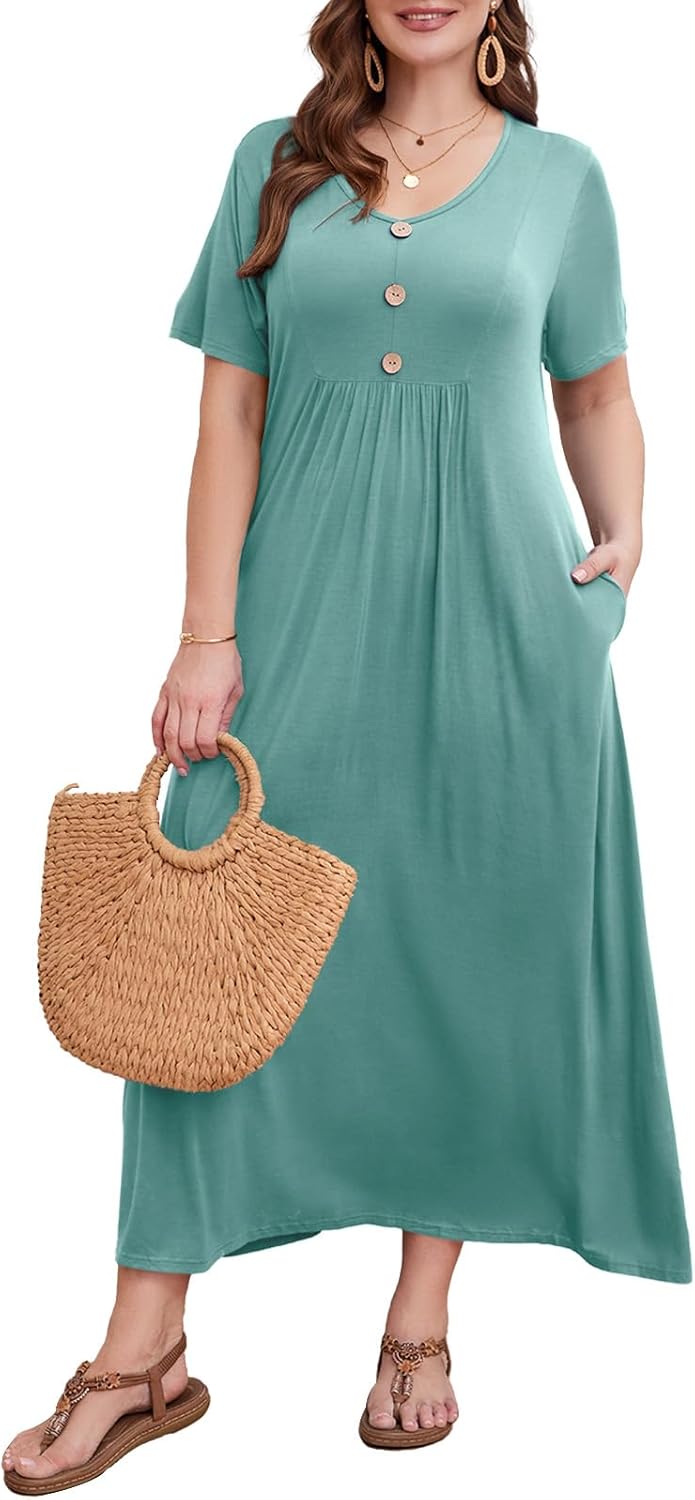 LARACE Womens Plus Size Short Sleeve Dresses Casual V Neck Button Up Pleated Flowy Long Maxi Dress with Pockets L-6XL